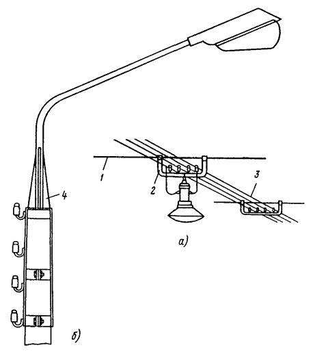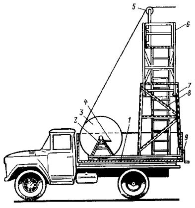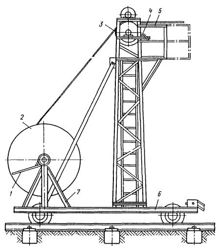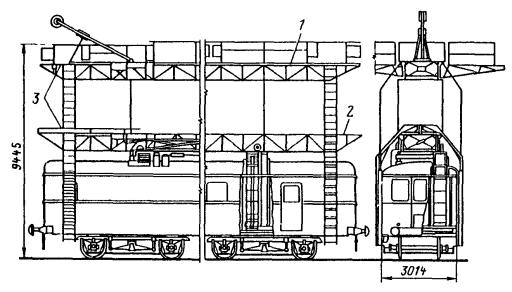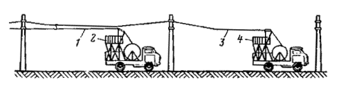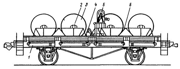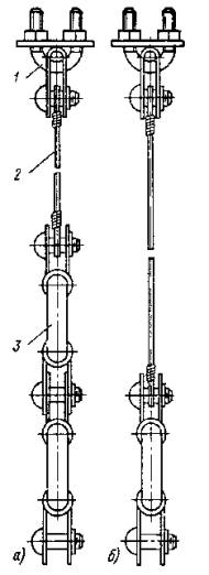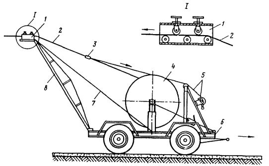 Примечание. Длины смежных пролетов не должны превышать 20 % значений, указанных в таблице. Замерять провес смонтированного троса необходимо в двух-трех пролетах на каждом конце участка и в середине. 8.4.7. Окончательно регулируют и заделывают подвесную систему после монтажа и закрепления на ней контактных проводов. 8.4.8. Длина пролетов подвесок на прямолинейных участках пути должна соответствовать приведенной в табл. 3. 8.5. МОНТАЖ КОНТАКТНЫХ ПРОВОДОВ8.5.1. В зависимости от местных условий высота подвешивания контактных проводов трамвая должна быть единой для всех трамвайных линий города в пределах 5,5-6,3 м. При сооружении в городе трамвайных линий впервые высота подвешивания контактных проводов должна быть 5,8 м. Контактные провода троллейбусных линий необходимо подвешивать на высоте 5,8 м. 8.5.2. Для трамвайных и троллейбусных контактных сетей могут применяться медные, низколегированные и бронзовые фасонные провода по ГОСТ 2584-75 и биметаллические фасонные провода (сталемедные, сталеалюминиевые и др.) по техническим условиям, утвержденным в установленном порядке. 8.5.3. При совместном креплении трамвайных и троллейбусных контактных проводов на общих поддерживающих устройствах высота их подвешивания должна быть одинаковой и приниматься равной: 5,6 м, если принятая в данном городе высота подвешивания проводов трамвая равна или не менее 5,6 м; высоте подвешивания проводов трамвая, если она 5,7-6 м; 6 м, если принятая высота подвешивания проводов трамвая более 6 м. 8.5.4. Монтировать контактные провода рекомендуется при помощи установок для раскатки и подъема проводов, автовышек или телескопической монтажной вышки, монтажной лебедки и т.п. 8.5.5. Раскатывать контактные провода следует «поверху». Раскатка проводов «понизу», как менее производительная, должна применяться в исключительных случаях. Раскатывать провод «поверху» рекомендуется специальной установкой (рис. 24), позволяющей монтировать одновременно два провода. Монтировать контактные провода с помощью специальной установки рекомендуется в следующей последовательности: на домкраты устанавливают барабаны с контактным проводом, монтируют узлы компенсирующих грузовых устройств, укладывают на рабочей площадке установки заготовленные монтажные крючки, установку транспортируют на трассу линии и устанавливают у анкерной опоры (подготовительные работы); концы проводов пропускают через раскаточные ролики, имеющиеся на рабочей (монтажной) поверхности установки, и крепят к анкерной опоре; начинают передвижение установки и раскатку проводов. Во время раскатки необходимо следить за тем, чтобы не было резких изменений направлений раскатываемых проводов и схлестывания витков провода на барабане; раскатываемый провод 3 укладывают в монтажные крючки 2 или подвязывают мягкой стальной проволокой к каждой поперечине 1 (рис. 28, а). На криволинейных участках (рис. 28, б) контактный провод крепят на подвесах (4 - подвес КСО-1; 5 - подвес КСЦ-1) монтажными хомутиками 6 или подвязывают к временным оттяжкам, изготавливаемым из стальной проволоки диаметром 5-6 мм; оттяжки закрепляют на опорах, расположенных с внешней стороны кривой, или на фиксаторных стойках - на внутренней стороне кривой. Такое закрепление проводов в положении, близком к проектному, позволяет при монтаже компенсированных анкеровок устанавл