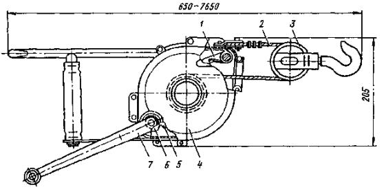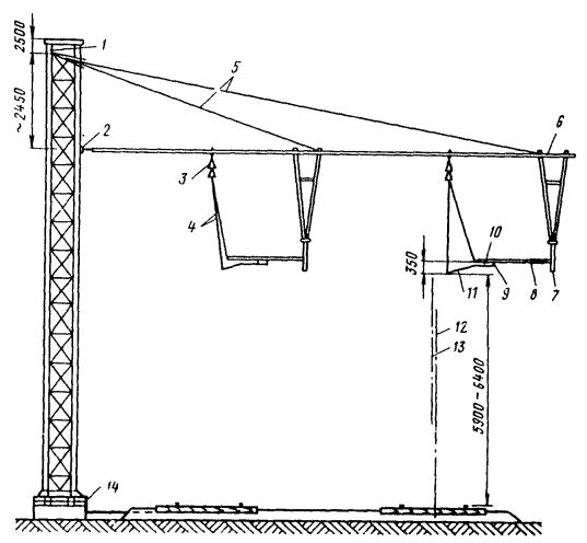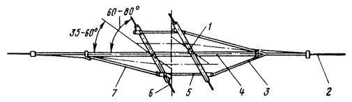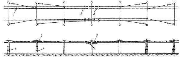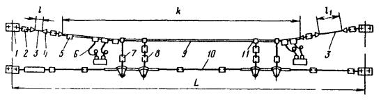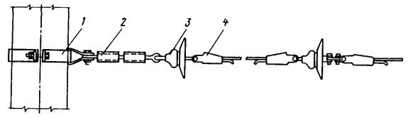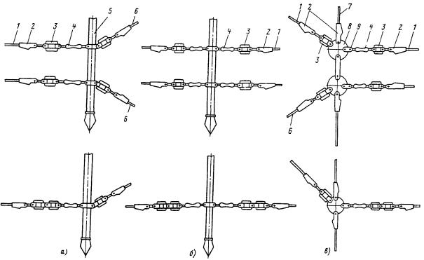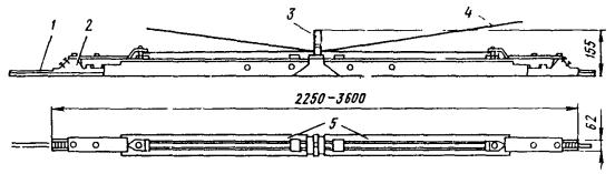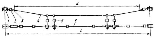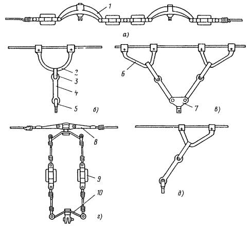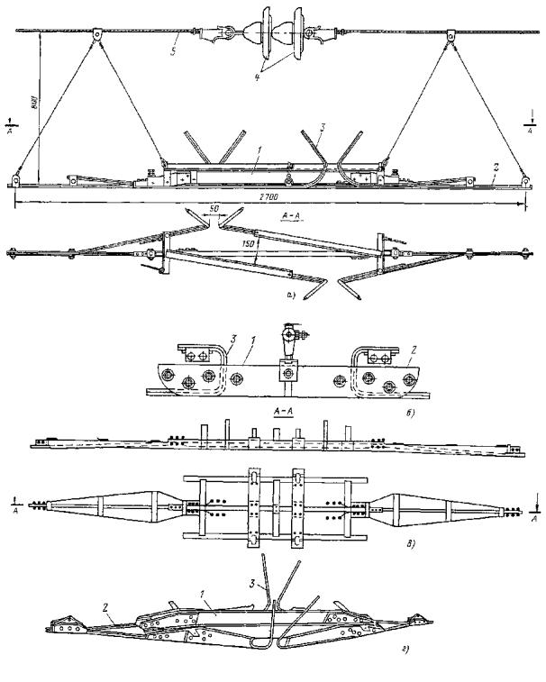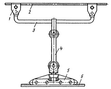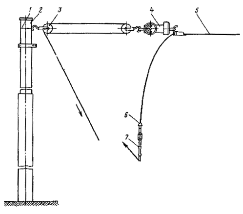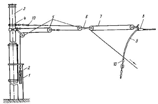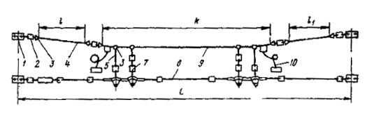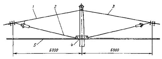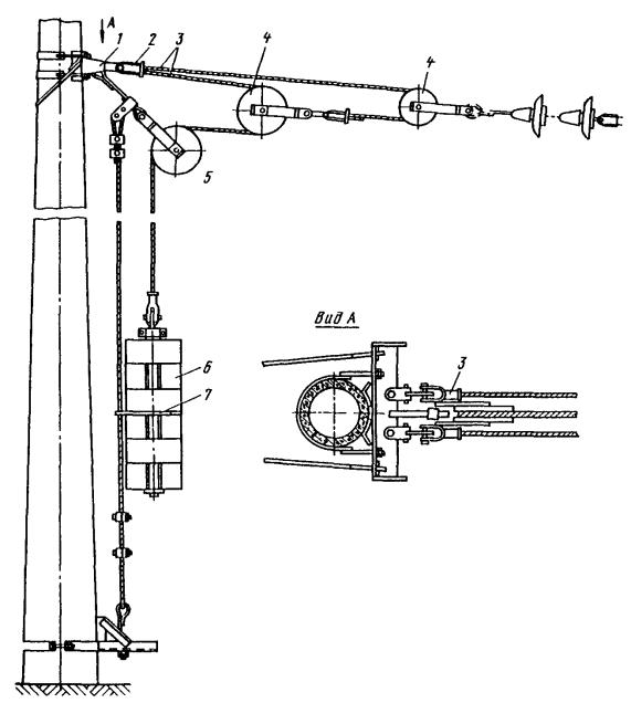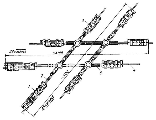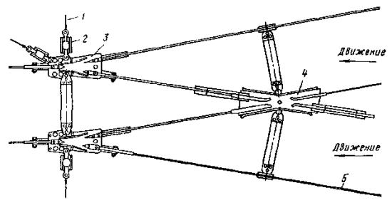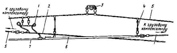 Рис. 46. Монтаж компенсированной анкеровки контактного провода с грузами внутри опоры Рис. 47. Устройство автоматического регулирования натяжения контактного провода троллейбусной линии: 1 - контактный провод; 2 - провододержатель; 3 - подвес; 4 - трос; 5 - ползун 8.9.13. Компенсировать контактные провода троллейбуса можно с помощью устройства автоматического регулирования натяжения (АРН) (рис. 47), монтируемого по схеме, приведенной на рис. 48. Вначале на смонтированный контактный провод на расстоянии 1,4-1,5 м друг от друга следует установить два провододержателя, а на гибкой поперечине смонтировать устройство АРН 3 (без провододержателей). После стягивания контактного провода 1 полиспастом (лебедкой) 5 необходимо вырезать отрезок провода между провододержателями и закрепить их в корпусе устройства АРН. Затем два отрезка стального каната длиной 3 м, имеющих с одной стороны клиновые зажимы, а с другой - изоляторы из дельта-древесины 2 следует соединить с корпусом устройства АРН и тросами блочных устройств 4 грузовых компенсаторов. С помощью полиспаста необходимо стянуть канаты между грузами компенсаторов 7 и провододержателями с закрепленными в них контактными проводами и соединить с корпусом устройства АРН, после чего полиспасты демонтировать и при необходимости отрегулировать высоту подвески устройства АРН (за счет изменения длины вертикальной струнки, соединяющей устройство АРН с гибкой поперечиной). Монтировать грузовые компенсаторы рекомендуется в соответствии с указаниями, приведенными в п. 8.9.10. Рис. 48. Монтаж устройства АРН Монтировать устройства АРН необходимо с монтажных автовышек. После выполнения монтажа устройства АРН установить грузоограничители 6, изготавливаемые из стального прутка или стальной полосы. 8.9.14. В некомпенсированных подвесках сезоннорегулирующие устройства монтируются: при простых подвесках на гибких поперечинах и при цепных - через каждые 400-500 м; при простых подвесках на кронштейнах - через каждые 300-400 м. Сезоннорегулирующие устройства следует устанавливать на прямолинейных участках пути или, как исключение, на криволинейных радиусом не менее 100 м. От мест с применением жестких подвесок (под мостами, путепроводами, эстакадами и пр.) и разворотных колец сезоннорегулирующие устройства необходимо смещать не менее чем на 200 м. 8.9.15. Сезонное регулирование натяжения контактных проводов некомпенсированных подвесок допускается осуществлять на стыковых соединениях. Для обеспечения качественного токосъема в некомпенсированных подвесках необходимо весной и осенью отрегулировать натяжение контактных проводов, т.е. сообщить проводам такое первоначальное натяжение, при котором в течение межрегулировочного сезона обеспечивались бы колебания натяжения (при изменениях температуры внешней среды) в пределах, допускаемых действующими нормативами. При каждом сезонном регулировании (весеннем или осеннем) исходное натяжение контактного провода и стрелу его провеса определяют по монтажным таблицам (или кривым) в зависимости от температуры. Для примера в приложении 8 приведены монтажные кривые для некомпенсированных подвесок с пролетом между пунктами крепления контактного провода 25 м. 8.10. МОНТАЖ СПЕЦИАЛЬНЫХ ЧАСТЕЙ8.10.1. К специальным частям контактной сети относят: пересечения, троллейбусные стрелки, секцион