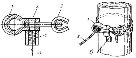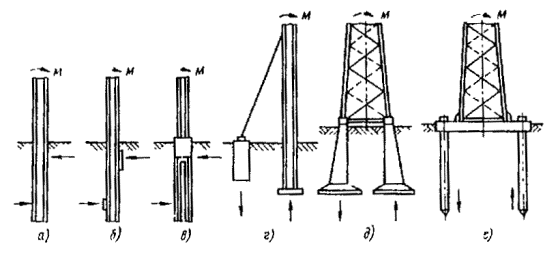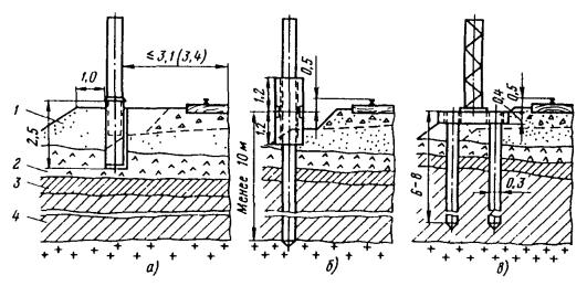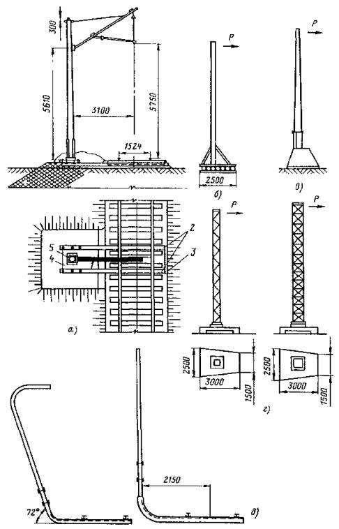 где d - диаметр опоры; α - угол наклона висящей на тросе опоры. Обычно этот угол равен 10° (tg 10° равен 0,176). Рис. 13. Приспособления для разворота опоры: а - втулочно-роликовое; б - тросовое; 1 - втулочно-роликовая цепь; 2 - зуб; 3 - патрубок; 4 - рукоятка; 5 - опора; 6 - стальной трос; 7 - крюк; 8 - ломик Рис 14. Закрепление опоры перед заливкой фундамента: 1 - распорки; 2 - замок; 3 - хомут; 4 - стойка; 5 - зажим Для железобетонных опор конической формы место стропки располагается на расстоянии 0,5-1,0 м от центра тяжести в сторону вершины. 7.4.22. В случае, если невозможно совместить развозку опор с одновременной разгрузкой, установкой и устройством монолитных бетонных фундаментов, устанавливать опоры следует, последовательно выполняя операции, перечисленные в п. 7.4.14. Рис. 15. Упор-ограничитель и установка с его помощью опоры: 1 - упор-ограничитель; 2 - опора Рис. 16. Замок-застежка и крепление им троса на опоре: а - замок-застежка; б - крепление на опоре; 1 - корпус замка; 2 - палец; 3 - коуш; 4 - пружина; 5 - канат 7.4.23. Опоры, устанавливаемые на неблагоустроенных улицах, в зонах зеленых насаждений, во дворах и т.п., должны иметь фундамент с бетонным оголовком, выступающим над уровнем грунта на 0,07-0,1 м для обеспечения отвода воды от основания опоры. 7.4.24. При установке опор во влажных грунтах, агрессивных к бетону и железобетону, заглубленные части железобетонных и стальных опор должны иметь изоляционное битумное покрытие, предохраняющее опоры от коррозии. 7.4.25. Расстояния, м, между фундаментом опоры контактной сети и подземными коммуникациями (согласно требованиям [9, 12]) должны быть следующими: Силовые кабели и кабели связи................................................................................... 0,5 Газопроводы низкого, среднего и высокого давления до 1,2 МПа (12 кгс/см2)..... 1 Водопроводы, дренажи, теплопроводы, трубопроводы горючих жидкостей......... 1,5 Канализация и водостоки............................................................................................. 3 7.4.26. В местах со слабым грунтом (торф, заболоченные участки трассы, насыпи с крутыми откосами и т.п.) опоры контактной сети необходимо устанавливать в бетонные блочные фундаменты с уширенной полкой (17, а), на сваи-стойки со сборным стаканным оголовком (17, б) или на двухсвайные фундаменты с ростверком и сваями (рис. 17, в) из бетона марки не ниже 400. При свайных фундаментах земляные работы не производятся. Для установки свайных фундаментов необходимо применять вибромолот или вибропогружатель. При этом конструкция свайных фундаментов и методы их погружения не должны допускать повреждений, обнажающих арматуру. 7.4.27. Металлические опоры и металлические детали железобетонных опор должны иметь стойкое антикоррозионное покрытие, а деревянные опоры пропитаны противогнилостным антисептическим составом. При окрашивании опор должна быть сохранена их маркировка. 7.4.28. При установке опор допускаются следующие отклонения от проектных данных: по глубине заделки опор в грунт - ± 0,1 м; наклон опор относительно вертикали не должен превышать 1/70 свободной высоты в сторону, противоположную действию нагрузок, и 1/100 длины опоры вдоль оси пути; наклон анкерных опор (с грузовым компенсатором) относительно вертикали не должен превышать 1/200 свободной высоты в сторону, противоположную действию основной нагрузки; по длине пролета +1 и -2 м. Если по гидротехническим или другим условиям требуется большее смещение опоры от проектн