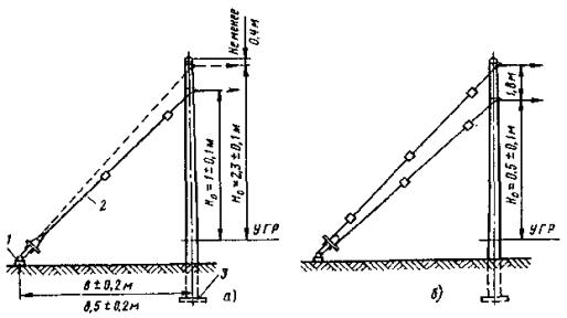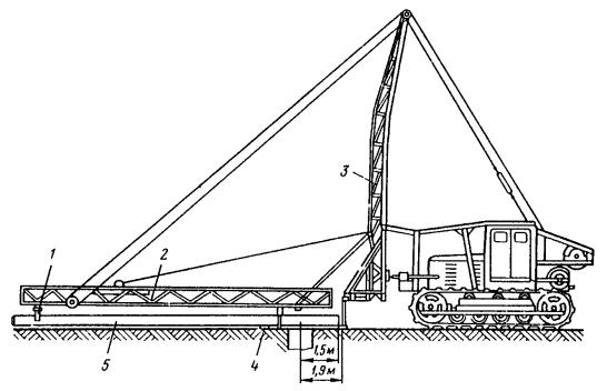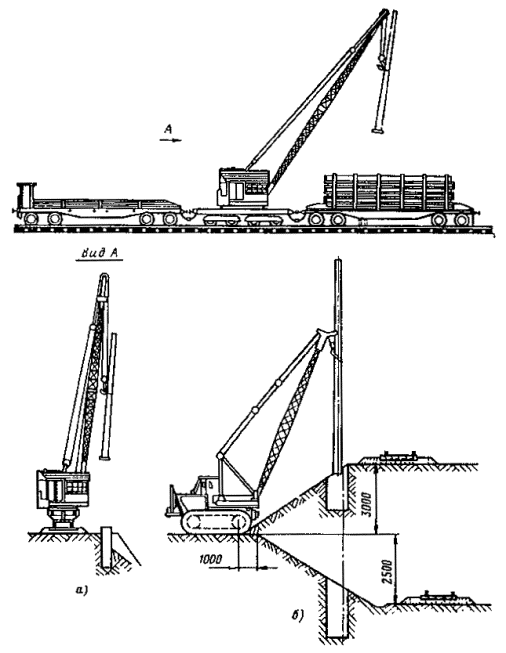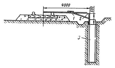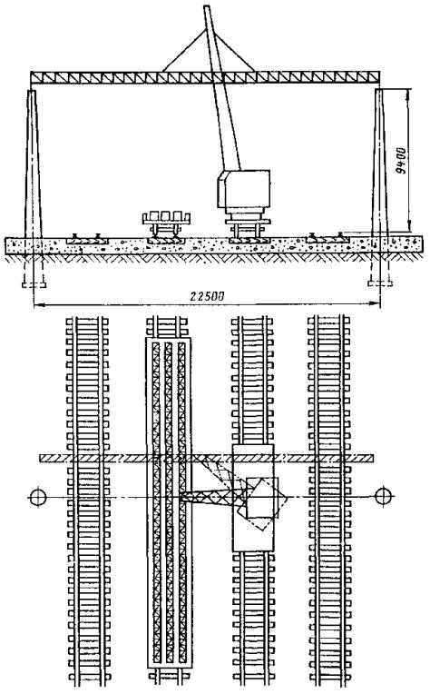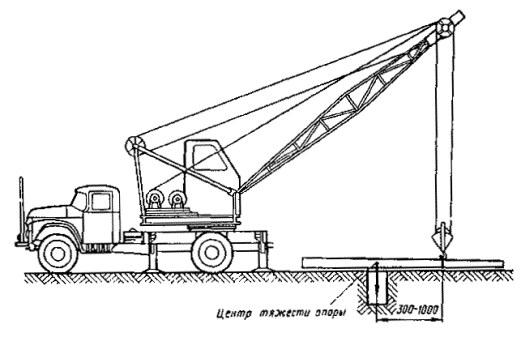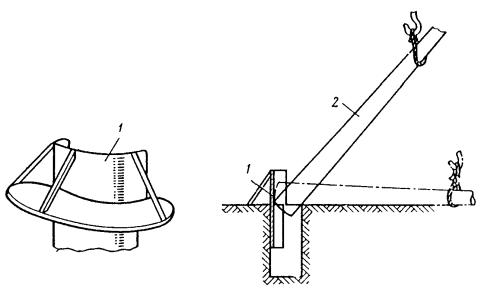 Примечание. В числителе - опоры расположены с любой стороны пути, в знаменателе - между путями. 7.4.12. Перед установкой фундамента или опоры в котлован необходимо: очистить котлован от посторонних предметов, а зимой также от снега и льда; проверить глубину котлована и размеры его в плане; проверить положение котлована относительно оси пути; выровнять стенки котлована; выровнять и уплотнить дно котлована. 7.4.13. Для предотвращения электрокоррозии арматуры железобетонные опоры следует устанавливать на заранее подготовленную бетонную (гравийную, щебеночную и т.п.) подушку толщиной не менее 0,15 м. 7.4.14. Скреплять опоры контактной сети городского электрифицированного транспорта с различными основаниями рекомендуется: путем заливки бетонным раствором установленной в котловане опоры; при помощи анкерных болтов, заделанных в фундаменте, на котором устанавливается опора, имеющая в основании фланец с необходимым количеством отверстий; путем заливки цементным раствором специального углубления в теле фундамента (стакана), в котором предварительно устанавливается опора; путем закрепления опоры металлическими клиньями (при установке ее в стальном стакане) с последующей заливкой бетоном. 7.4.15. Устанавливать фундаменты и опоры контактных сетей следует кранами общего назначения (например, ЛАЗ-690, КО-2561Г и др.) или специальными (например, КЛЭП-7). Устанавливать фундаменты необходимо краном с применением стропов. 7.4.16. Проверять правильность установки фундамента 3 следует шаблоном 2 и уровнем 1 (рис. 8). При этом необходимо выверить по горизонтали расстояние от фундамента до оси пути, а по вертикали - положение фундамента относительно головки рельса. 7.4.17. Устанавливать сборные фундаменты в зимнее время необходимо сразу за разработкой котлованов, не допуская разрыва между этими операциями более суток. Фундамент сначала тщательно очищают от снега и льда, а затем устанавливают вплотную к вертикальной стенке котлована для обеспечения его максимальной устойчивости при действии основных нагрузок. 7.4.18. При установке опоры кранами общего назначения ее следует укладывать таким образом, чтобы центр тяжести опоры совпадал с центром отверстия котлована (рис. 9), а при установке краном КЛЭП-7 торец опоры должен находиться на расстоянии 1,5 м от центра котлована (рис. 10). Для сетей промышленного транспорта устанавливать опоры можно автомобильным краном, поставленным на железнодорожную платформу (рис. 11). 7.4.19. Устанавливать опоры для рельсового электрифицированного транспорта рекомендуется способами «с пути» (рис. 12, а) или «с поля» (рис. 12, б), описанными в [7, п. 1.9]. Рис. 8. Проверка положения фундамента Рис. 9. Выкладка железобетонной опоры перед установкой ее в котлован автомобильным краном общего назначения Рис. 10. Крепление опоры к телескопической стреле крапа КЛЭП-7: 1 - тросовая затяжка для захвата опоры; 2 - телескопическая стрела; 3 - опорная стрела; 4 - прокладка; 5 - опора Рис. 11. Установка автомобильного крана К-32 на железнодорожной платформе Рис. 12. Установка опоры «с пути» и «с поля» При большом объеме работ по установке опор целесообразно последовательно совмещать развозку опор по трассе с одновременной разгрузкой, установкой и устройством монолитных бетонных фундаментов. Такая технология требует четкой координации работы автомашины с прицепом для пере