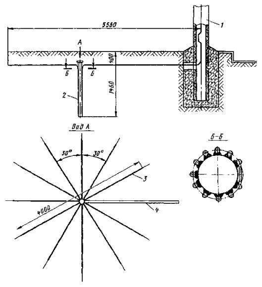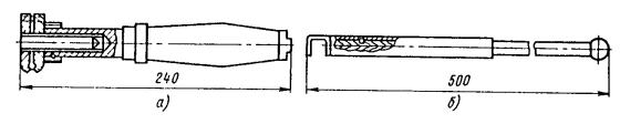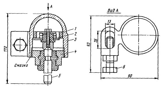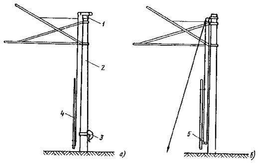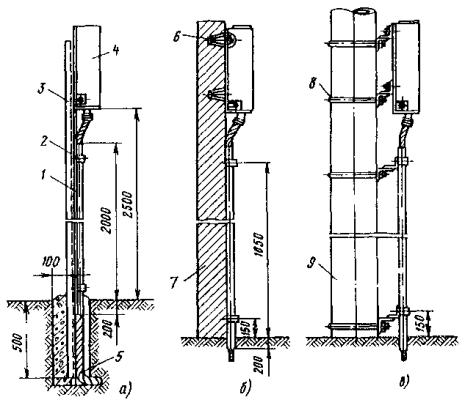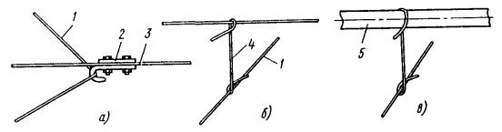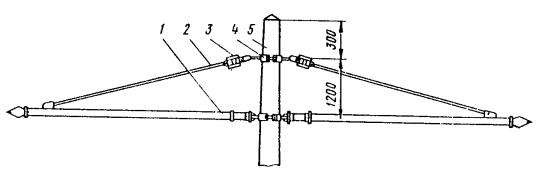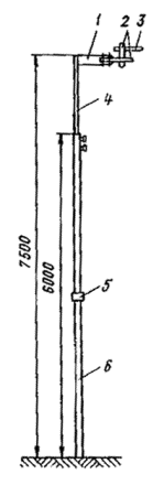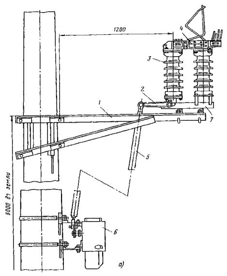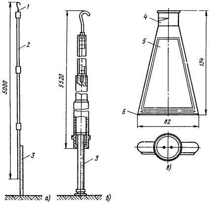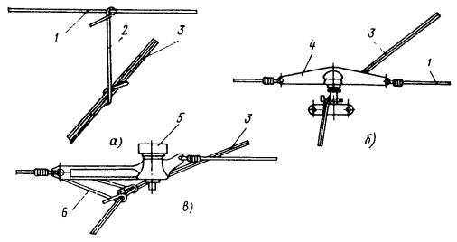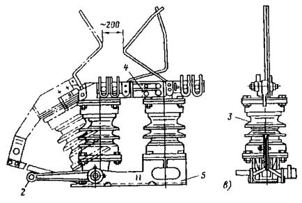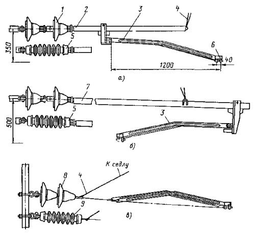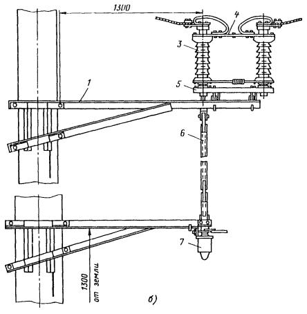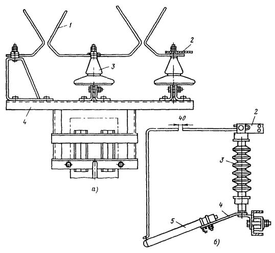 Рис. 81. Разъединители: а - переменного тока с механическим приводом; б - переменного тока с ручным приводом, в - секционный РСУ-3000/3,3; 1 - кронштейн; 2 - рычаг; 3 - изолятор; 4 - контактные ножи; 5 - опорная рама; 6 - вал; 7 - привод на опору поднять вал разъединителя и соединить с тягой (рычагом) разъединителя; на высоте 1,1-1,5 м от уровня земли установить кронштейн привода разъединителя; на кронштейн установить и закрепить привод разъединителя. Вал разъединителя посредством соединительной муфты, позволяющей осуществлять регулирование угла поворота вала, соединить с рычагом привода; проводом МГ разъединитель через контактные выводы подключить к контактному проводу; кронштейны разъединителя и привода заземлить путем присоединения заземляющих проводников к общему заземляющему спуску. Привод разъединителя заземлить двойным заземлителем. Нельзя устанавливать искровые промежутки в заземляющие спуски; проверить надежность разъединителя, несколько раз включив и отключив его. Нож разъединителя должен плотно прилегать к контактным губкам по всей длине их рабочей поверхности и не иметь перекосов. Плотность прилегания контактов разъединителя проверяется щупом толщиной 0,05 мм и шириной 10 мм. 9.6.9. В контактной сети постоянного тока необходимо устанавливать роговые, а в сети переменного тока - трубчатые грозовые разрядники. Места установки разрядников определяются проектом. 9.6.10. Роговые разрядники обычно устанавливаются через каждые 1000-1500 м на переходных опорах, в местах присоединения питающих проводов и у тяговых подстанций. 9.6.11. Монтаж рогового разрядника с двумя искровыми воздушными промежутками (рис. 82, а) необходимо производить в следующей последовательности: скомплектованный и отрегулированный (расстояние между рогами должно быть 5±1 мм) в мастерской разрядник поднять на вершину опоры с помощью веревки, перекинутой через ролик, который укреплен на опоре, или с помощью полиспаста и закрепить на ранее установленной на опоре конструкции. При установке разрядника не на вершине опоры заземляемый рог должен располагаться со стороны опоры; рог, закрепленный на изоляторе, соединить медным проводом сечением не менее 25 мм2 с контактным проводом; Рис. 82. Роговой грозовой разрядник с двумя искровыми воздушными промежутками: 1 - рог разрядника; 2 - зажим для присоединения контактного провода; 3 - изолятор; 4 - основание; 5 - разрядник другой крайний рог соединить с рельсом или заземленной металлической конструкцией; вторично шаблоном проверить зазор между рогами. 9.6.12. Трубчатый разрядник (рис. 82, б) следует установить на специальной стальной конструкции. Расстояние от места установки конструкции на консоли до места крепления тяги должно быть не менее 0,6 м. Разрядник необходимо установить так, чтобы указатель срабатывания был отчетливо виден с земли. Внешний искровой промежуток в разряднике должен быть 40 мм. Для предотвращения возможного скопления влаги во внутренней полости разрядника его необходимо установить открытым концом вниз под углом не менее 15, а в местах усиленного загрязнения - под углом до 45° к горизонтали. Электрод внешнего искрового промежутка, закрепляемый стержневым изолятором, следует присоединить к контактной сети медным проводом сечением не менее 16 мм2, а заземляющий провод трубчатого разрядника - к тяговому рельсу или специаль