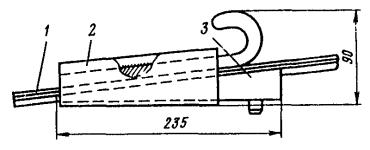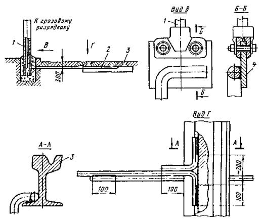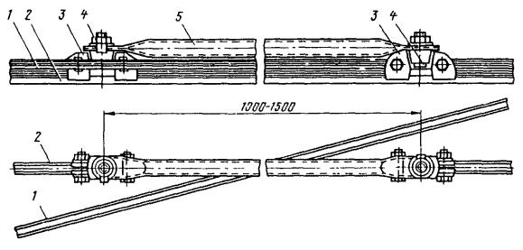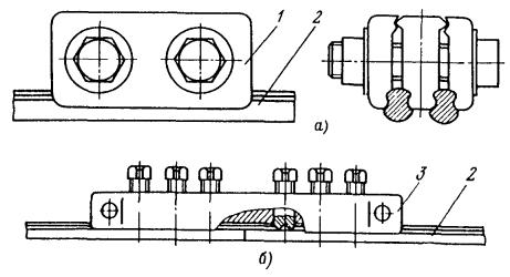 Рис. 85. Присоединение заземляющего проводника к рельсу: 1 - зажим, 2 - заземляющий проводник, 3 - рельс; 4 - крюковой болт Рис. 86. Электрический стыковой соединитель
