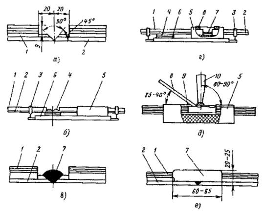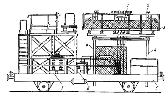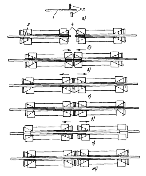 *1 даН = 10 Н ≈ 1 кгс. Примечание. В числителе приводится минимальное напряжение в подвесках, в знаменателе - максимальное. Рис. 34. Передвижная установка для холодной сварки контактных проводок 1 - сварочная головка; 2 - подвижная рама с натяжным устройством; 3 - рабочая площадка; 4 - телескопические цилиндры; 5 - железнодорожная платформа; 6 - масляная насосная станция; 7 - передвижная электростанция АБ-8-Т/230 8.5.21. Стыковые соединения контактных проводов могут быть выполнены также холодной сваркой, осуществляемой с помощью передвижной установки (рис. 34), разработанной ЛенПЭО ВНИИПЭМ, или машины МСХП-40. Установку монтируют на железнодорожной платформе или другом транспортном средстве. На платформе установлены оборудование для холодной сварки и устройство для испытания прочности сварного шва соединяемых проводов. Технологический процесс холодной сварки контактного провода и испытания прочности сварного шва приведен на рис. 35: а - обрезка провода перед сваркой; б - зажим провода в матрицы; в - сварка провода давлением; г - освобождение провода из матриц; д - зажим сваренного провода для испытания; е - испытание прочности сварного шва растяжением; ж - освобождение провода после испытания. Рис. 35. Технологический процесс холодной сварки контактного провода и испытания прочности сварного шва: 1 - провод; 2 - ножи; 3 - матрица испытания; 4 - матрицы сварки Холодная сварка контактного провода осуществляется в сварочной головке тремя осадками (опрессованиями). Для стыкового соединения кусков контактных приводов холодной сваркой в стационарных условиях (например, в МЭЗ) рекомендуется применять стационарные машины МСХС-30. 8.6. КОМПЛЕКСНЫЙ МЕТОД МОНТАЖА КОНТАКТНЫХ ПРОВОДОВ В ЦЕПНЫХ ПОЛУКОМПЕНСИРОВАННЫХ ПОДВЕСКАХ8.6.1. Комплексный метод является наиболее совершенным, позволяющим осуществлять монтаж контактных сетей без остановки движения автотранспорта. Комплексный метод рекомендуется применять при большом объеме монтажных работ по сооружению контактных сетей, а также при наличии на участках монтажа большого количества криволинейных отрезков пути малого радиуса. 8.6.2. Монтировать контактные сети при комплексном методе следует в два этапа: а) подготовить механизмы и приспособления и смонтировать поперечины и компенсирующие устройства. Компенсаторы на анкерных опорах оставить в полной готовности, чтобы можно было при раскатке заделать на них контактные провода (подготовительные работы); б) раскатать, поднять и подвесить несущий трос и контактный провод. 8.6.3. Для выполнения работ необходимо подготовить две установки (рис. 24) или два монтажных поезда, состоящих из кабельных транспортеров с барабанами троса (провода) и автовышек. 8.6.4. Работы следует выполнять по схеме, приведенной на рис. 36. Сначала раскатывают с барабана установки 4 несущий трос 3. Затем установку останавливают у первой анкерной опоры. Конец троса поднимают вверх, пропускают через ролик, установленный на монтажной площадке, и анкеруют через изолятор на проектной высоте. После этого автомобиль с установкой 4 трогается с места и начинается раскатка троса. При раскатке барабан с тросом притормаживают ручным тормозом для придания тросу первоначального натяжения и равномерного (без рывков) разматывания троса. Монтажник, находящийся на монтажной площадке установки, должен заправить тро