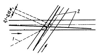 В простых и фиксирующих гибких поперечинах изоляция должна устанавливаться: в местах крепления контактных проводов к поперечинам; между соседними линиями, если расстояние между ними более 6 м, на расстоянии 1,5 - 2 м от контактного провода; на расстоянии 1,5 - 2 м от контактного провода в сторону крепления поперечины к опорным конструкциям; посередине между двумя линиями, если расстояние между ними 3-6 м; в местах крепления поперечин к опорным конструкциям. 1.6. В простых и цепных троллейбусных подвесках номинальное расстояние между контактными проводами одной линии должно составлять 0,50±0,02 м. Примечание. При применении в узле подвешивания пряжечных изоляторов ИП-1 это расстояние должно составлять 0,48 м, изоляторов ИП-2 - 0,5 м, изоляторов из дельта-древесины - 0,52 м. В эластичной контактной подвеске на наклонных струнах расстояние между контактными проводами одной линии может быть увеличено до 0,7 м. На специальных частях контактной сети отклонение от номинального расстояния между проводами допускается от 0,4 до 0,7 м. 1.7. В местах пересечения трамвайных или троллейбусных линий с неэлектрифицированными железнодорожными путями, а также на путях, по которым предусмотрено совмещенное движение железнодорожного и трамвайного подвижного состава, контактные провода следует располагать на высоте не ниже 5,75 м относительно головки железнодорожного рельса. 1.8. Пересечения и взаимные сближения контактных сетей промышленного электрифицированного транспорта, трамвая и троллейбуса с линиями связи и радиофикации необходимо осуществлять в соответствии с требованиями ГОСТ 67-67. Пересечения контактных сетей с проводами линий связи и радиофикации допускаются только в пролетах между опорами контактной сети под углом около 90, но не менее 45°. Нижние провода линий связи, пересекающие контактные сети (с учетом наихудших метеорологических условий для данной местности: гололеда, измороси или максимальной температуры), следует располагать в пролете пересечения на высоте не менее 8 м от головки рельса и не менее 10,5 м от полотна дорожного покрытия (для троллейбуса). 1.9. Пересечения и сближения воздушных линий электропередачи (ВЛ) напряжением до 1000 В с проводами и тросами контактных сетей должны выполняться в соответствии с требованиями гл. 11-4 ПУЭ [3]. При пересечении ВЛ напряжением до 1000 В с контактными проводами и несущими тросами трамвайных и троллейбусных линий провода ВЛ при наибольшей стреле провеса следует располагать на высоте не менее 8 м от головки рельса трамвайной линии и не менее 10,5 м от полотна дорожного покрытия (для троллейбуса). При этом во всех случаях расстояние от проводов ВЛ до несущего троса или контактного провода должно быть не менее 1,5 м. 1.10. Опоры контактной сети необходимо удалять от ВЛ напряжением до 1000 В на расстояние (в плане) не менее 1,5 м (в стесненных условиях - не менее 1 м). 1.11. ВЛ напряжением до 1000 В, проходящие параллельно трамвайным и троллейбусным линиям, как правило, должны быть расположены вне зоны, занятой контактной сетью, включая и опоры. Допускается расположение проводов ВЛ напряжением до 1000 В над поперечинами контактной сети, только если по местным условиям опоры этой сети отклоняются от нормального размещения по отношению к проезжей части (на площадях, разворотных кольцах, криволинейных участках пути и др.) на протяжени