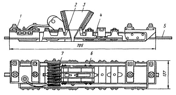 1Количество проводов на двуплечих подвесах до четырех. 2Количество проводов на двуплечих подвесах до восьми. 3Количество проводов на двуплечих подвесах до пятнадцати. Рис. 30. Приспособление для монтажа контактного провода трамвайной линии: 1 - ручка тормоза, 2 - барабан с контактным проводом; 3 - раскаточный ролик; 4 - устройство для выполнения зигзага контактного провода; 5 - площадка; 6 - рама; 7 - кабельный домкрат 8.5.11. Углы излома контактных проводов трамвайных линий (в горизонтальной плоскости) при применении изолированных подвесов КСО, КСУ, КОО, КОЦ не должны превышать для медного провода сечением 65 мм2 - 18°, соответственно 85 мм2 - 14; 100 мм2 - 12; для сталеалюминиевого провода - 14. При применении подвесной арматуры других конструкций углы излома контактных проводов следует принимать в соответствии с техническими данными этих конструкций. 8.5.12. Окончательное натяжение контактных проводов следует проверять динамометром или по стреле провеса провода, определяемой как разность между средней высотой провода под двумя соседними точками подвешивания и в середине пролета от отметки полотна пути. Значения натяжения указаны в проекте. 8.5.13. Посадка контактного провода в подвесной зажим должна быть плотной, без перекосов. Трамвайные и троллейбусные провода рекомендуется подвешивать в универсальных подвесных зажимах (рис. 31). Благодаря имеющимся в этих зажимах винтам с внутренним четырехгранником, упрощается процесс закрепления провода в зажимах, улучшается качество соединения, так как с помощью четырехгранного ключа можно легко и надежно затянуть винты. 8.5.14. Подвесные зажимы следует устанавливать таким образом, чтобы головки винтов (болтов) на прямолинейном участке пути размещались с наружной стороны пары проводов, а на криволинейном - с внешней стороны кривой. 8.5.15. Стыковое соединение контактных проводов следует выполнять соединительными зажимами (рис. 32). 8.5.16. В трамвайной сети стыковое соединение контактных проводов выполняют в трех соединительных зажимах ЗС (рис. 32, а), располагаемых на расстоянии не более 0,5 м один от другого. Соединяемые провода следует располагать в одной горизонтальной плоскости, а их концы должны быть отогнуты вверх и в сторону другого провода. Рекомендуется выполнять соединения трамвайных проводов под подвесами. В этом случае вместо соединительного зажима в середине соединения необходимо устанавливать подвесной зажим на два провода. При этом в пролете допускается соединение проводов, но не далее 5 м от подвеса. 8.5.17. В троллейбусной сети стыковое соединение контактных проводов следует выполнять соединительными зажимами ЗСТБ по ГОСТ 14124-69 (рис. 32, б). Стык проводов следует располагать не далее 5 м от точек подвешивания контактного провода. Концы соединяемых проводов троллейбуса должны иметь ровную плоскость обреза, перпендикулярную оси провода. Края среза провода и фаски должны быть зачищены от заусенцев. Перед установкой стыковой зажим должен быть тщательно проверен на соответствие паза проводу путем поочередного надвигания паза на каждый конец соединяемых проводов. Если провод заходит в паз очень слабо, необходимо уменьшить ширину паза зажима, равномерно и легко обстучав молотком его нижнюю часть. 8.5.18. Для стыкового соединения контактных проводов соединительный зажим необходимо надвинуть на конец од