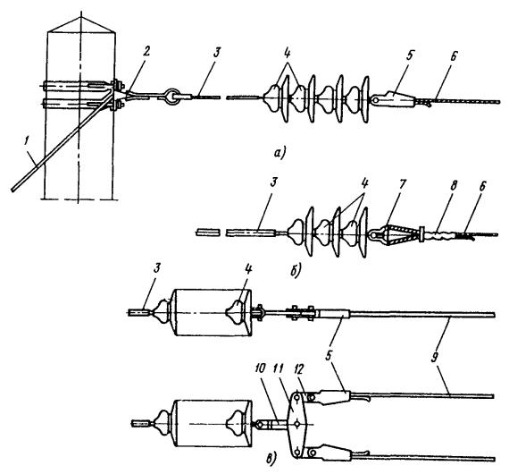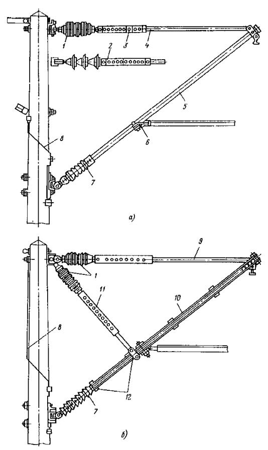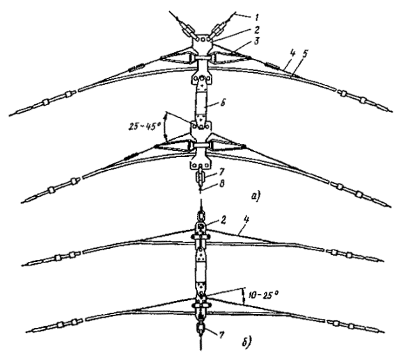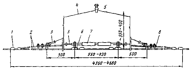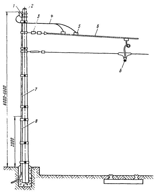 Рис. 43. Средняя анкеровка контактного трамвайного провода продольным несущим тросом Рис. 44. Средняя анкеровка контактного провода с помощью опор: 1 - вспомогательный трос; 2 - несущий трос; 3 - узел подвески троса; 4 - изолятор из дельта-древесины; 5 - хомут; 6 - контактный провод; 7 - зажим средней анкеровки для провода; 8 - скользящий подвес В этом случае высоту подвески грузов компенсаторов hМ определяют по формуле