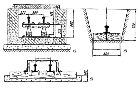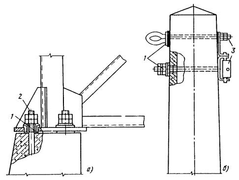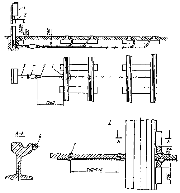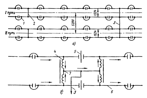 Рис. 87. Электрические рельсовые соединения: 1 - стыковой соединитель; 2 - междурельсовый соединитель; 3 - междупутный соединитель; 4 - обмотки; 5 - изолированный стык; 6 - рельсы; 7 - средние точки дроссель-трансформатора соседних путей 9.8.10. Для уменьшения сопротивления рельсовой сети необходимо соединять рельсовые нити и отдельные путь между собой (рис. 87, а). Междурельсовые и междупутные электрические соединения на линиях постоянного тока должны выполняться проводами сечением 70 мм2 и более в медном эквиваленте (медный эквивалент означает, что сечение проводника из другого металла должно быть приведено к сечению медного проводника с тем же сопротивлением, что и рассматриваемый проводник). Рис. 88. Изоляция анкерных болтов фундаментов и деталей крепления консоли от металлических опор 9.8.11. На участках электрифицированных железных дорог промышленного транспорта, не оснащенных устройствами автоблокировки и централизации, в соответствии с проектом необходимо установить стыковые междурельсовые и междупутные соединители. На участках пути, оборудованных автоблокировкой и централизацией, рельсы следует разделить на отдельные блок-участки, электрически разъединенные между собой изолированными стыками. В этом случае непрерывная цепь для тягового тока обеспечивается дросселями (дроссель-трансформаторами). Схема включения дроссель-трансформатора приведена на рис. 87, б. Средние точки дроссель-трансформатора соседних путей необходимо соединить между собой проводом. Таблица 7