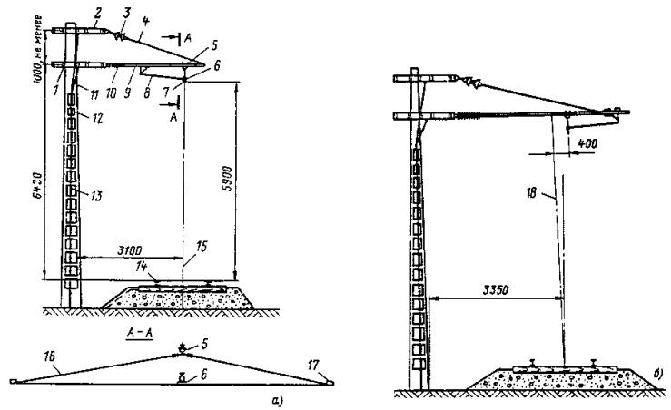 1. ОБЩИЕ ПОЛОЖЕНИЯ1.1. Сооружение контактных сетей должно производиться по утвержденным проектам с соблюдением требований действующих Правил устройства электроустановок (ПУЭ), строительных норм и правил (СНиП), настоящей Инструкции и других нормативных документов. 1.2. При монтаже контактных сетей следует применять прогрессивную технологию и индустриальные методы, перенося большинство работ за пределы зоны монтажа: на заводы, полигоны и в мастерские. 1.3. Материалы и конструкции, применяемые при сооружении контактной сети, должны соответствовать утвержденному проекту, требованиям государственных стандартов и технических условий. 1.4. Элементы оборудования контактной подвески, находящиеся под напряжением, должны быть удалены: а) от опорных конструкций на расстояние (по горизонтали), м, не менее; 1,5 - для городского электрифицированного транспорта; 0,8 - для промышленного электрифицированного транспорта системы постоянного тока; 1,0 - для промышленного электрифицированного транспорта системы переменного тока; б) от оборудования ближайшей линии - на расстояние не менее 1,5 м (в стесненных условиях допускается 1 м). 1.5. Несущие тросы трамвайных цепных контактных подвесок должны иметь одну ступень изоляции относительно поддерживающих их устройств, а несущие тросы троллейбусных цепных подвесок, кроме того, должны быть изолированы от находящихся под напряжением элементов контактной сети. Оба несущих троса троллейбусной цепной подвески рекомендуется секционировать путем установки в них изоляторов через каждые 5-6 пролетов подвески.