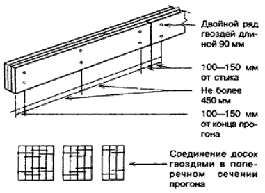 Элементы несущих конструкций могут скрепляться друг с другом также с помощью соединительных накладок (угловых листов). 8.2.2.5 Используемые для уменьшения пролетов и размеров сечения стропил промежуточные опоры в виде затяжек должны изготовляться из пиломатериала сечением не менее 38´89 мм. Затяжки длиной более 2,4 м должны соединяться между собой вблизи своей середины неразрезными элементами (связями) сечением не менее 19´89 мм, расположенными под прямым углом к затяжкам. 8.2.2.6 Гвоздевые крепления элементов каркаса (кроме приведенных в 8.2.2.4) следует исполнять в соответствии с таблицей 8.2. Таблица 8.2