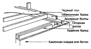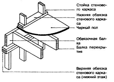 6.3 Опирание внутренних стен и перегородок на каркас перекрытия 6.3.1 Перегородки должны опираться на черный пол. Перегородка, располагаемая параллельно балкам перекрытия, но между ними, должна через черный пол опираться на деревянные распорки между балками (рисунок 6.13). Рисунок 6.13 - Опирание перегородок 6.3.2 Деревянные распорки для опоры перегородок должны выполняться из брусков сечением не менее 38´89 мм и устанавливаться через 1,2 м. 6.3.3 Перегородки, устанавливаемые под прямым углом к балкам перекрытия, могут размещаться произвольно, по выбору заказчика. 6.3.4 Несущие внутренние стены должны через черный пол опираться на прогоны или на расположенные ниже несущие стены. Допускается несущие внутренние стены, расположенные под прямым углом к балкам перекрытия, устанавливать на расстоянии не более 900 мм от опоры балок, если на них опирается только чердачное перекрытие (при неэксплуатируемом чердаке), и не более 600 мм от опоры балок, если на них передается нагрузка от одного или более междуэтажных перекрытий. При необходимости смещения стены на большее расстояние от опор размер сечения балок должен приниматься на основании расчета. 6.4 Черные полы 6.4.1 Черные полы следует устраивать под покрытие пола, если оно не обладает достаточной прочностью для восприятия расчетных нагрузок. 6.4.2 Черные полы устраивают из: фанеры по ГОСТ 11539, ГОСТ 3916.1 или ГОСТ 3916.2; пиломатериалов хвойных пород по ГОСТ 24454; цементно-стружечных плит марки ЦСП-1 по ГОСТ 26816; древесностружечных плит нешлифованных, повышенной водостойкости, класса эмиссии формальдегида Е1 по ГОСТ 10632; гипсоволокнистых плит по ГОСТ Р 51829. Допускается использовать другие материалы, не уступающие перечисленным по прочности и жесткости и разрешенные для применения в строительстве жилых зданий. 6.4.3 Толщина черного пола должна соответствовать таблице 6.2. Таблица 6.2