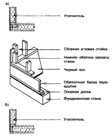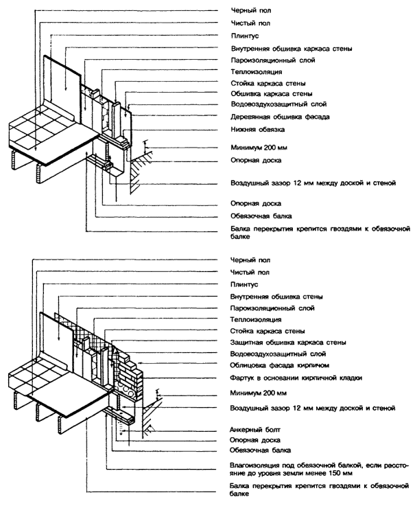 7.2.4 Стойки стен должны быть непрерывными и цельными по всей высоте этажа (кроме стоек у проемов). 7.2.5 В случаях, указанных в 7.2.1, должны предусматриваться связи жесткости. В наружных стенах в качестве связей жесткости рекомендуется использовать доски сечением не менее 18 ´ 88 мм, прибиваемые под углом 45° к стойкам в плоскости каркаса на каждом этаже. Эти доски должны врезаться в стойки таким образом, чтобы не препятствовать креплению обшивок к стойкам. Во внутренних стенах в качестве связей жесткости, предотвращающих потерю устойчивости стоек, могут использоваться деревянные бруски, которые устанавливаются враспор между стойками в середине их высоты и прибиваются к каждой стойке. 7.2.6 Верхние обвязки в несущих стенах должны по высоте состоять, как правило, из двух досок, нижние - из одной доски. На участке стены, включающем перемычку над дверным проемом, допускается иметь верхнюю обвязку из одной доски при условии, что обвязка прибита к перемычке. Верхнюю обвязку из одной доски допускается также использовать в случаях, когда балки перекрытия и стойки каркаса вышележащего этажа или стропила крыши, через которые передается нагрузка на обвязку, опираются на нее в пределах не более 50 мм от грани стоек, на которые опирается обвязка. 7.2.7 Обвязки должны быть выполнены из досок толщиной не менее 38 мм. Ширина обвязки должна приниматься не менее высоты сечения стоек. Во внутренних стенах, в которых стойки расположены непосредственно над балками перекрытия, допускается применять нижнюю обвязку толщиной 18 мм. 7.2.8 В наружных стенах нижняя обвязка может выступать за пределы опоры (например, над стеной подвала), но не более чем на одну треть своей ширины. 7.2.9 Нижняя доска верхней обвязки прибивается к каждой стойке. Стыки отдельных элементов нижней доски должны располагаться над стойками. Верхняя доска верхней обвязки прибивается к нижней доске таким образом, чтобы стыки в ней были смещены по отношению к стыкам в нижней обвязке на расстояние, равное одному шагу стоек. 7.2.10 В углах и пересечениях стен и перегородок нижние доски верхних обвязок должны соединяться встык, а верхние доски верхних обвязок должны перекрывать эти стыки. В случаях, когда невозможно или нецелесообразно выполнить это требование, для соединения нижних досок верхних обвязок в углах и пересечениях следует использовать соединительные накладки из полосы оцинкованной стали размером 75´150 мм, толщиной 0,9 мм, прибиваемые к каждому элементу не менее чем тремя гвоздями длиной 60 мм. Допускается применять другие способы соединения, обеспечивающие неменьшую прочность. Примечание - Конструкция верхней обвязки каркаса стен связана с принятой технологией производства работ, которая предусматривает сборку стен с верхней обвязкой из одной доски в горизонтальном положении на перекрытии, подъем и установку в проектное положение, затем установку верхней доски верхней обвязки таким образом, чтобы обеспечить жесткость каркаса стены в продольном направлении и в угловых соединениях стен. На следующем этапе на верхнюю обвязку опирают концы балок перекрытия. 7.2.11 Каркас в углах наружных стен рекомендуется устраивать на двух или трех стойках (см. примеры на рисунке 7.2). При соединении на трех стойках дополнительная стойка, устанавливаемая длинной стороной сечения параллельно стене, предн