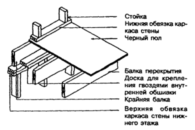 6.6.4 Клей, используемый для наклейки настила пола из паркетных щитов и клепок, должен подходить для соединения древесины с материалом черного пола. 6.6.5 Упругие покрытия пола должны приклеиваться к основанию клеями, совместимыми с материалом покрытия и стойкими к воде и щелочам. 7 СТЕНЫ И ПЕРЕГОРОДКИСНиП 31-02 предъявляет к стенам дома требования по прочности и деформативности при расчетных значениях воздействий и нагрузок, пределу огнестойкости и классу пожарной опасности, долговечности. Наружные стены должны соответствовать также требованиям по сопротивлению теплопередаче из условий энергосбережения, по защите от проникновения внутрь конструкции атмосферной влаги и воздуха, по предотвращению накопления конденсата водяных паров внутри конструкции, а также по обеспечению снижения звукового давления от внешних источников шума до нормативного уровня. Внутренние стены, разделяющие жилые блоки в блокированном доме, должны удовлетворять требованиям к индексу изоляции воздушного шума. Требования к обеспечению теплоизоляции, защиты от воздухопроницания и паропроницания стен приведены в разделе 9. Требования к устройству наружной отделки стен, а также к обеспечению защиты от проникновения атмосферной влаги внутрь конструкций наружных стен приведены в разделе 10. 7.1 Общие требования к конструкции 7.1.1 Стены и перегородки состоят из деревянного каркаса, обшивки (наружной и внутренней по отношению к ограждаемому помещению) и отделочных (облицовочных) слоев. При необходимости в стенах располагают слои, обеспечивающие теплозвукоизоляцию, пароизоляцию и защиту от проникновения воздуха и воды. Каркас стен воспринимает нагрузки от перекрытий и крыши дома. На каркас перегородок нагрузки от перекрытий и крыши не должны передаваться. 7.1.2 Положения 6.1.2 - 6.1.9 настоящего Свода правил распространяются также на стены домов. 7.2 Устройство каркаса 7.2.1 Каркас стен (рисунок 7.1) состоит из вертикальных стоек и горизонтальных элементов (верхняя и нижняя обвязки, перемычки над оконными и дверными проемами). Стойки в пределах каждого этажа опираются на нижние обвязки каркаса стены, которые через элементы каркаса перекрытий передают нагрузку на верхние обвязки каркаса стен нижерасположенного этажа (каркас «платформенного» типа с поэтажными стойками). Обшивки каркаса, если они выполняются из жестких плитных или листовых материалов или из пиломатериалов, обеспечивают жесткость каркаса при восприятии ветровых нагрузок и предотвращают потерю устойчивости стоек. При отсутствии жестких обшивок должны использоваться диагональные связи жесткости или распорки в соответствии с требованиями 7.2.5. Рисунок 7.1 - Каркас стены Вертикальные и горизонтальные элементы каркаса стен разделяют внутреннее пространство стены на замкнутые ячейки и выполняют функции противопожарных диафрагм. 7.2.2 Элементы каркаса стен должны выполняться из пиломатериалов хвойных пород не ниже 2-го сорта по ГОСТ 8486. Приведенные в настоящем Своде правил положения относятся к каркасу стен со стойками сплошного прямоугольного сечения. Допускается использование стоек другой конструкции (например, стоек решетчатой конструкции). 7.2.3 Сечение и шаг стоек каркаса стен должны рассчитываться в зависимости от положения стоек по высоте дома и от передаваемой на них нагрузки. При этом дол