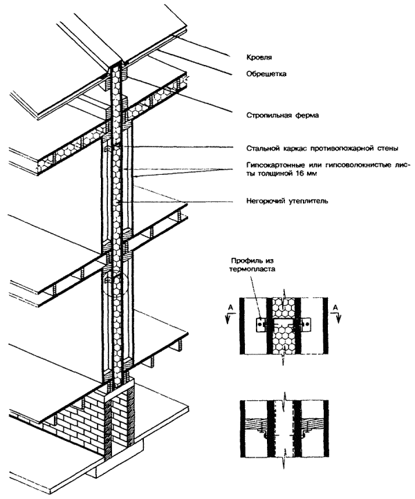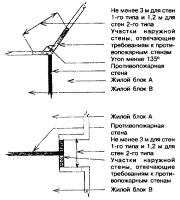 7.3.5.3 Все края листов или плит обшивок должны располагаться над опорами (элементами каркаса или обрешетки). 7.3.5.4 Подготовка обшивки каркаса стен к отделке должна выполняться в полном соответствии с технологическими инструкциями по строительству домов данной системы. 7.3.5.5 Дополнительные требования к креплению наружной защитной обшивки каркаса наружных стен приведены в разделе 10. 7.4 Требования к противопожарным стенам 7.4.1 Противопожарные стены, разделяющие блокированный дом на пожарные отсеки и на жилые блоки, должны удовлетворять требованиям 5.13 СНиП 21-01 и 6.10 СНиП 31-02. 7.4.2 При каменных стенах выполнение требования 7.4.1 достигается за счет того, что прогоны или балки перекрытия, опирающиеся с обеих сторон на стену, не соединяются между собой. По их концам должны устраиваться скосы, предотвращающие разрушение стены при обрушении балок или прогонов (рисунок 7.5). Рисунок 7.5 - Каменная противопожарная стена В местах опирания балок или прогонов на противопожарные стены из бетона или каменной кладки в этих стенах допускается предусматривать гнезда. Размер сечения стены в месте гнезда должен быть не менее 120 мм для стены 1-го типа и 60 мм для стены 2-го типа. 7.4.3 В каркасных стенах выполнение требования 7.4.1 достигается устройством сдвоенного каркаса стен и размещением между каркасами смежных блоков самонесущей противопожарной стены 2-го типа со стальным каркасом, облицовками из гипсокартонных или гипсоволокнистых листов толщиной не менее 15,9 мм и негорючим утеплителем (рисунок 7.6). Допускается эту стену выполнять с деревянным каркасом при сдвоенных облицовках общей толщиной не менее 25 мм. Рисунок 7.6 - Межквартирная противопожарная стена 2-го типа каркасной конструкции Связь между противопожарной стеной и каркасами смежных блоков осуществляется самонарезающими винтами через дискретные легкоплавкие элементы, например, в виде отрезка профиля из термопласта. Число таких связей должно быть достаточным, чтобы обеспечить устойчивость стены в процессе строительства и после обрушения каркаса одного из блоков при пожаре. 7.4.4 В случаях, когда наружные стены и покрытия выполнены с применением материалов групп горючести Г2, Г3 и Г4 (отдельные дискретно расположенные элементы и пленки общей массой до 5 кг/м2 площади стены или покрытия не учитываются), противопожарные стены должны пересекать эти конструкции и выступать за их пределы: противопожарные стены 1-го типа над кровлей - не менее чем на 0,6 м, за наружную плоскость стены - не менее чем на 0,3 м; противопожарные стены 2-го типа над кровлей и за наружную плоскость стены - не менее чем на 0,15 м. В случаях, описанных в 7.4.5, противопожарные стены могут не пересекать наружные стены. 7.4.5 В случаях, когда противопожарная стена разделяет пожарные отсеки или жилые блоки, наружные стены которых находятся под углом 135° и менее, участки наружных стен, образующие этот угол, общей длиной 1,2 м для смежных жилых блоков и 3,0 м для смежных пожарных отсеков должны (независимо от этажности дома) иметь предел огнестойкости и класс пожарной опасности не ниже требуемых для соответствующей противопожарной стены (рисунок 7.7). Рисунок 7.7 - Варианты устройства противопожарной стены в местах примыкания соседних блоков 7.5 Обеспечение звукоизоляции 7.5.1 Выполнение требования СНиП 31-02 к индексу изоляции воздушного шума стеной, раздел