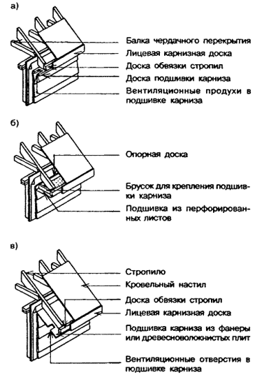 8.2.4 Стропильные фермы 8.2.4.1 Вместо несущего каркаса скатных крыш, собираемого на месте, могут применяться стропильные фермы, изготавливаемые в заводских условиях или собираемые предварительно на строительной площадке. 8.2.4.2 Проектирование стропильных ферм, в том числе стыковых соединений их элементов, должно осуществляться в соответствии с требованиями СНиП II-25. 8.2.4.3 Стропильные фермы со сжатыми элементами решетки, длина которых превышает 1,8 м, должны иметь поперечную систему связей во избежание продольного изгиба. Система связей должка состоять из досок сечением не менее 19´89 мм, прибитых под прямым углом к элементам решетки вблизи их середины минимум двумя гвоздями длиной 60 мм для каждого элемента. 8.2.4.4 Элементы стропильных ферм не допускается пропиливать, надрезать, просверливать, вызывая их ослабление, если это не предусматривается в рабочих чертежах элементов ферм. 8.2.5 Несущий каркас плоской крыши (рисунок 8.4) Примечание - Пунктирными линиями показан вариант узла. Рисунок 8.4 - Каркас плоской крыши 8.2.5.1 Высота сечения кровельных балок, принятая по таблицам Б.4, Б.5, может быть недостаточной для размещения в пространствах между балками утеплителя требуемой толщины и обеспечения вентилируемого пространства в соответствии с 8.7.11. В таких случаях высота сечения кровельных балок должна быть увеличена на необходимую величину. 8.2.5.2 Кровельные балки крепятся к обвязке несущих стен двумя гвоздями длиной 80 мм вкосую каждая. 8.2.5.3 Уклон крыши (не менее 1:50) должен обеспечиваться укладкой подкладок под опорную часть балок на одной из несущих стен или укладкой на балки деревянных подкладок переменной толщины. 8.3 Карнизы 8.3.1 Карнизы устраиваются путем выпуска концов стропил или кровельных балок за наружную поверхность стены (например, как показано на рисунках 8.4 и 8.5), к торцам которых крепится обвязка толщиной не менее 38 мм. На обвязку стропил или кровельных балок должен опираться нижний край кровельного настила. 8.3.2 Для подшивки карнизов могут применяться: фанера толщиной не менее 6 мм, перфорированные металлические полосы с антикоррозионным покрытием, доски толщиной не менее 19 мм. В случаях, когда вынос карниза не превышает 300 мм (при уклоне кровли 1:1 и более), подшивка выполняется только из досок и крепится непосредственно к стропилам (рисунок 8.5, а). При большей величине выноса карниза для крепления подшивки рекомендуется предусматривать устройство обрешетки, включающей опорную доску, прибиваемую к стойкам каркаса стены поверх защитной обшивки стены, и бруски, прибиваемые к опорной доске и к обвязке стропил (рисунок 8.5, б). Подшивка карниза может выполняться наклонной. В этом случае она крепится непосредственно к стропилам (рисунок 8.5, в). а - вынос карниза не более 300 мм; б - вынос карниза более 300 мм, подшивка карниза горизонтальная; в - вынос карниза более 300 мм, подшивка карниза наклонная Рисунок 8.5 - Устройство карнизов 8.3.3 В подшивке карнизов должны иметься вентиляционные отверстия. Чтобы предотвратить попадание утеплителя чердачного перекрытия на вентиляционные отверстия в подшивке карниза, необходимо, чтобы верх защитной обшивки стены располагался выше верхней обвязочной балки в стене, но при этом расстояние между верхом обшивки стены и низом кровельного настила должно быть не менее 25 мм (для обеспечения вентиляции). 8.3.5 Пазухи в 