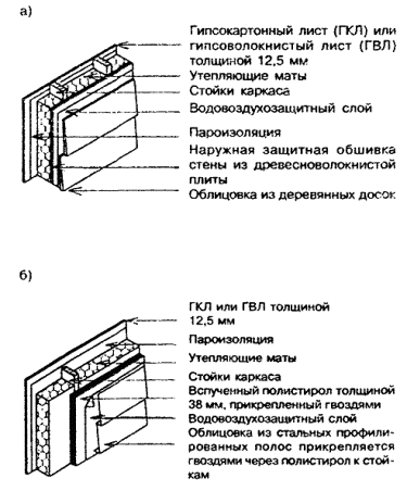 9.3.2 Обеспечение защиты от воздухопроницания 9.3.2.1 Расчетное сопротивление воздухопроницанию ограждающих конструкций дома должно быть не ниже требуемого по СНиП II-3. 9.3.2.2 Для обеспечения требуемого сопротивления воздухопроницанию ограждающих конструкций они должны включать слои из материалов с достаточно низкой воздухопроницаемостью, в том числе могут быть использованы: кровельные и гидроизоляционные рулонные материалы; гипсокартонные и гипсоволокнистые листы толщиной не менее 12,5 мм; фанера толщиной не менее 8 мм; жесткие древесноволокнистые плиты толщиной не менее 6 мм; экструдированый полистирол толщиной не менее 40 мм; уретановая теплоизоляция с подложкой из фольги толщиной не менее 25 мм; алюминиевая фольга; полиэтиленовая пленка толщиной не менее 0,15 мм. 9.3.2.3 При использовании в конструкциях слоев из материалов, характеристики воздухопроницаемости которых неизвестны, выполнение требования 9.3.2.1 должно быть подтверждено результатами испытаний конструкций в соответствии с ГОСТ 25891. 9.3.2.4 Воздухопроницаемость окон и балконных дверей, используемых при строительстве домов, не должна при испытаниях в соответствии с ГОСТ 26602.2 превышать 3,5 м3/ч×м2 при разности давлений 10 Па. 9.3.2.5 Для защиты от проницания наружного воздуха внутрь утепленных наружных стен в их конструкции предусматривается устройство: - наружной защитной обшивки стенового каркаса; - водовоздухозащитного слоя; - облицовочного слоя или наружной штукатурки. 9.3.2.6 Наружную защитную обшивку стенового каркаса предусматривают в тех случаях, когда требуется защита от влаги утепляющего слоя, а также когда под наружную облицовку требуется устройство сплошного основания (сплошной обрешетки). Для применения в качестве наружной защитной обшивки каркаса должны использоваться обшивочные материалы (таблица 7.3), низкая водо- и воздухопроницаемость которых обеспечивается либо свойствами самих материалов, либо за счет наклейки в заводских условиях на наружную поверхность плит и листов из таких материалов полиэтиленовой пленки или фольги. 9.3.2.7 Стыки листов или плит наружной защитной обшивки стенового каркаса должны быть заполнены герметиком. Пиломатериалы в наружной защитной обшивке должны быть уложены с соединением в шпунт. В случае использования для наружной защитной обшивки теплоизоляционных материалов с наклеенным слоем фольги или полиэтиленовой пленки стыки листов или плит должны оставляться незаполненными. 9.3.2.8 В случаях, когда наружная защитная обшивка стенового каркаса не предусматривается, а также в случаях, когда наружная защитная обшивка стенового каркаса выполняется из материалов на древесной основе (например, из фанеры, древесностружечных плит, пиломатериалов), требуется устройство водовоздухозащитного слоя, укладываемого по внешней стороне утеплителя, а при наличии защитной обшивки - по ее внешней поверхности. 9.3.2.9 Водовоздухозащитный слой выполняется из специального водовоздухозащитного материала (например, полиолефин, перфорированный полиэтилен), обладающего низкой водо- и воздухопроницаемостью, но проницаемого для водяных паров1, уложенного не мене чем в два слоя непосредственно по утеплителю и не менее чем в один слой - по поверхности наружной защитной обшивки каркаса. По поверхности наружной защитной обшивки допускается устраивать водо