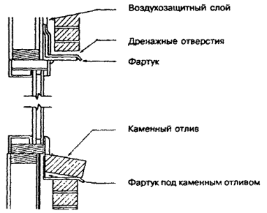 10.3.5.3 На фартук, изготовленный из алюминиевых сплавов, соприкасающийся с каменной кладкой или бетоном (раствором), следует нанести эффективное изолирующее покрытие или проложить между ним и кладкой (бетоном, раствором) водонепроницаемую пленку. 10.3.5.4 Детали для крепления фартука должны обладать коррозионной стойкостью. Металл, из которого они изготовлены, должен быть совместим с металлом фартука: эти изделия не должны быть подвержены электрохимической коррозии. 10.3.5.5 В фартуке, составленном из нескольких полос материала, стыки полос должны выполняться водонепроницаемыми. 10.3.5.6 Фартуки в каменной облицовке стен следует устанавливать: а) под наружными каменными подоконниками-отливами (рисунок 10.2); б) под дренажными отверстиями (рисунок 10.3); в) над оконными или дверными проемами в наружных стенах, если расстояние по вертикали между верхом оконной или дверной коробки и нижним краем карниза (свеса крыши) более одной четверти размера горизонтального выноса карниза. Рисунок 10.2 - Установка фартука под каменным отливом Рисунок 10.3 - Фартук под дренажными отверстиями каменной облицовки Рисунок 10.4 - Фартук над оконным (дверным) проемом 10.3.5.7 Фартуки под наружными отливами окон и над оконными (дверными) проемами в стенах с каменной облицовкой следует размещать от наружной поверхности облицовки в глубь конструкции и отгибать вверх за отлив окна или за перемычку, поддерживающую часть облицовки над проемом. Фартук под оконными отливами допускается не устанавливать, если на нижней поверхности отливов предусмотрен капельник глубиной 10 мм на расстоянии не менее 25 мм от наружной поверхности стены. 10.3.5.8 Фартук под дренажным отверстием в каменной облицовке каркасной стены должен быть установлен таким образом, чтобы один его конец выступал не менее чем на 5 мм за наружную поверхность опоры облицовки, а другой конец был заведен в глубь конструкции и завернут на высоту 150 мм за облицовку в воздушную прослойку между нею и каркасом стены. 10.3.5.9 В стене каркасной конструкции, в которой устраивается водовоздухозащитный слой или наружная защитная обшивка каркаса, отогнутую вверх часть фартука следует заводить за этот слой или обшивку. 10.3.5.10 Дренажные отверстия должны располагаться с шагом не более 800 мм и обеспечивать сообщение с наружным воздухом нижних зон воздушных прослоек, расположенных между кирпичной облицовкой и каркасными стенами. 10.3.5.11 Места сопряжения оконных и дверных коробок с каменной кладкой должны быть загерметизированы в соответствии с указаниями 10.4.4. 10.3.5.12 При кладке каменной облицовки необходимо следить за тем, чтобы упавший в воздушную прослойку раствор не образовывал мостиков между облицовкой и обшивкой стен, позволяющих просочившейся воде проникать внутрь помещений. 10.4 Облицовка наружных стен из различных материалов 10.4.1 Общие требования 10.4.1.1 Настоящий раздел относится к наружным облицовкам стен, выполняемым из пиломатериалов, фанеры, плитных и листовых материалов на основе древесины, асбестоцементных плиток или листов, асбестоцементной кровельной плитки, алюминия, стали. Защита наружных стен от попадания в них дождевой воды и снега наряду с облицовкой обеспечивается водоотводящими фартуками, устройством в необходимых случаях воздушных прослоек, герметизацией сопряжений элементов стен. 10.4.1.2 Облицовка из древесн