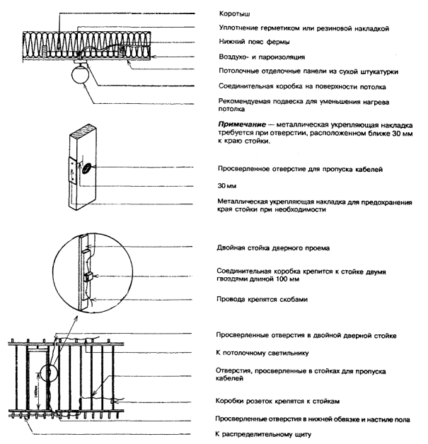 7.2.14 Перемычки должны состоять, как правило, из двух досок, поставленных на ребро и соединенных в один элемент гвоздями. Толщина перемычки должна быть равна ширине стоек, обрамляющих проем. При необходимости для обеспечения требуемой толщины перемычки между двумя ее досками могут быть вставлены прокладки (деревянные или из жесткого утеплителя). Крепление перемычек - гвоздями через стойки в торец. 7.2.15 Пролеты и размеры по высоте сечения деревянных перемычек должны определяться расчетом. В случаях, когда пролеты балок перекрытия не превышают 4,9 м, а пролеты стропильных ферм не превышают 9,8 м, допускается принимать пролеты и предельные размеры сечения для перемычек в несущих стенах по приложению Б (таблицы Б.12 – Б.14). При применении в несущих стенах стоек сечением, меньшим чем 38´89 мм, можно принимать максимальные значения пролетов по упомянутым таблицам при условии, что длина перемычек не превышает 2,25 м, а минимальная высота их сечения не менее чем на 50 мм превышает указанную в этих таблицах. 7.2.16 Устройство гвоздевых соединений элементов каркаса стен должно соответствовать таблице 7.2. 7.2.17 Стойки и верхние обвязки каркаса стен при необходимости можно пропиливать, прорезать, просверливать, но таким образом, чтобы при этом неповрежденная часть сечения составляла не менее: двух третей толщины сечения для несущей стойки или 40 мм для ненесущей стойки; 50 мм по ширине обвязки. При большем ослаблении сечения элементов каркаса необходимо их дополнительное усиление. 7.2.18 В каркасе стен должны быть предусмотрены детали для крепления внутренней обшивки стен и подшивки потолка. Пример устройства таких деталей приведен на рисунке 7.4. Рисунок 7.4 - Деталь установки доски для крепления внутренней обшивки 7.3 Обшивка стен 7.3.1 Обшивка каркаса наружных стен со стороны помещений, внутренних стен и перегородок с обеих сторон должна выполняться из жестких плитных или листовых материалов или из пиломатериалов. Она обеспечивает пространственную жесткость каркаса стен и служит основой для последующей отделки или облицовки стен. В случаях, когда нормируется предел огнестойкости и класс пожарной опасности стен, обшивка из материала с соответствующими пожарно-техническими характеристиками может выполнять огнезащитные функции. 7.3.2 Обшивка каркаса стены с наружной стороны жесткими плитными или листовыми материалами может предусматриваться для выполнения совместно с другими конструктивными слоями несущих и изоляционных функций, а также для использования в качестве сплошной обрешетки для крепления наружной облицовки стены (см. разделы 9 и 10 настоящего Свода правил). 7.3.3 Толщину материалов для обшивки стен в зависимости от шага стоек каркаса стен, к которым они крепятся, рекомендуется принимать не менее указанной в таблице 7.3. Таблица 7.3