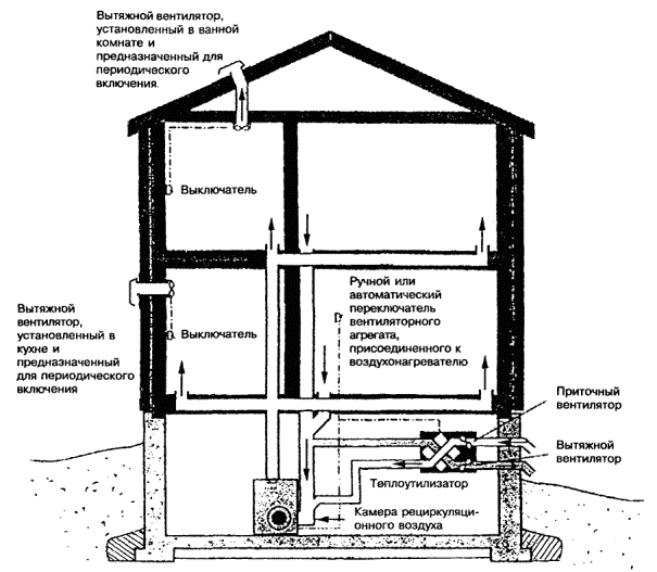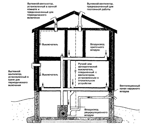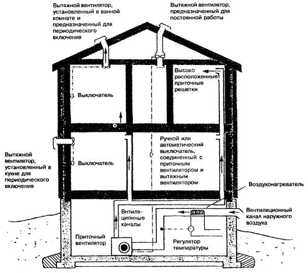 8.3.1 В доме, оборудованном вентиляцией с механическим побуждением, приточные вентиляционные каналы должны обеспечивать поступление наружного воздуха через приточные отверстия воздуховодов. Подача воздуха обеспечивается приточным вентилятором, к которому через воздухозаборное устройство поступает наружный воздух. Удаление воздуха из помещений должно обеспечиваться вытяжным вентилятором, устанавливаемым в чердачном помещении. Наружный воздух в таких системах перед поступлением в воздуховоды проходит систему фильтров и подогревается до температуры, которую обитатели дома считают комфортной.