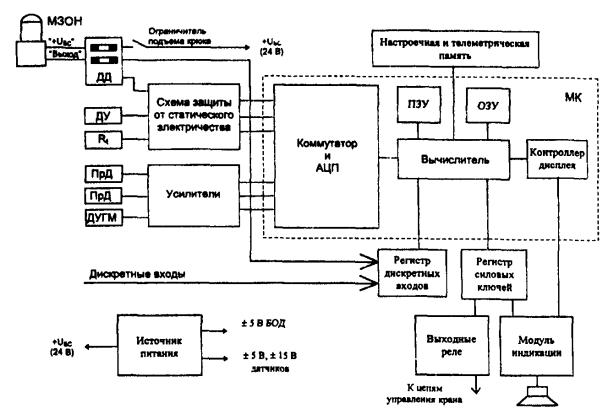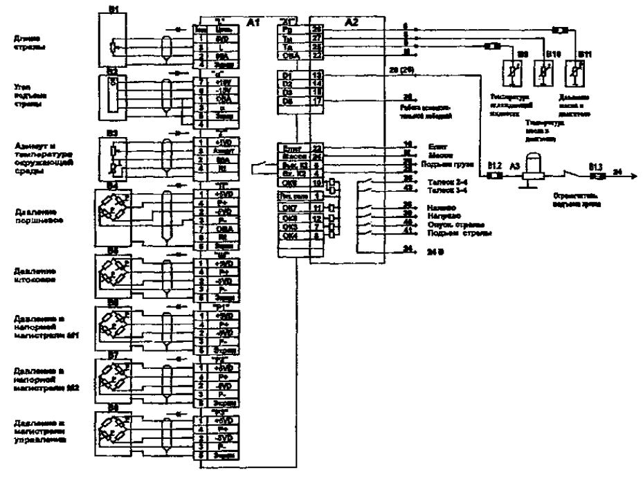 * БТП входит в состав блока обработки данных. 1.4. Устройство и работа прибора1.4.1. Принцип действия прибора основан на последовательном опросе и преобразовании аналоговых сигналов с датчиков первичной информации в цифровой код, определении угла наклона и длины стрелы, расчете цифровыми методами величины вылета и высоты подъема стрелы (по заданным геометрическим размерам рабочего оборудования крана), а также вычислении фактической массы груза и степени загрузки крана с последующим их сравнением с предельно допустимыми значениями при выбранном режиме работы. Блок-схема прибора приведена на рис. 1. Рис. 1. Блок-схема прибора ОНК-140: МЗОН - модуль защиты от опасного напряжения; ДД - датчик длины стрелы; ДУ - датчик угла (азимута); ДУГМ - датчик угла маятниковый (датчик подъема стрелы); БОД - блок обработки данных; ПрД - преобразователь (датчик) давления; МК - микроконтроллер; ПЗУ и ОЗУ - постоянное и оперативное запоминающие устройства; АЦП - аналого-цифровой преобразователь; Rt - терморезистор - датчик температуры 1.4.2. Прибор подключается к системе управления крана (рис. 2) посредством разъемов: через разъем X1 БОД и блок выходных реле проходят цепи управления исполнительными механизмами, цепи питания изделия, сигналы с концевых выключателей, связанных с ручками управления крана; датчики подключаются к прибору через индивидуальные разъемы. Рис. 2. Схема подключения прибора ОНК-140-13 на кране: А1 - блок обработки данных; А2 - блок выходных реле; A3 - модуль защиты от опасного напряжения; В1 - датчик длины стрелы; В2 - датчик угла подъема стрелы маятниковый; В3 - датчик азимута; В4-В8 - преобразователь давления; В9, В 10 - датчик температуры ТМ-100В; В11 - датчик давления MM359 Примечание. Датчики В10, В11 - элементы крана. 1.4.3. Работа прибора осуществляется под управлением программы, заложенной в память микропроцессорного контроллера БОД. Программное обеспечение включает в себя подпрограмму тестирования, подпрограмму настройки и рабочую программу. При запуске подпрограммы тестирования (нажатии клавиши «Тест») вычислитель проверяет исправность оперативного запоминающего устройства (ОЗУ), постоянного запоминающего устройства (ПЗУ), аналого-цифрового преобразователя (АЦП), модуля индикации (МИ) и однокристального микропроцессорного контроллера (ОМК). Кроме того, после подачи напряжения питания и в процессе работы ведется контроль состояния линий связи датчиков (на обрыв и замыкание) и контроль исправности ОМК. При прохождении теста модуля индикации в трех младших разрядах всех индикаторов жидкокристаллических цифровых (ИЖЦ) последовательно отображаются цифры от 9 до 1 (частота смены информации около 1 с) и поочередно (слева направо и сверху вниз) кратковременно включаются светодиодные индикаторы. Подпрограмма настройки выполняется при установке переключателя «Работа» - «Настройка» в положение «Настройка». Переключатель находится под опломбированной крышкой на верхней или боковой стенке БОД и используется при настройке и привязке прибора на кране. При этом имеется возможность изменения содержимого настроечного ПЗУ. Рабочая программа выполняется при установке переключателя «Работа» - «Настройка» в положение «Работа». 1.4.4. Управление работой изделия (ввод режимов работы крана и/или параметров координатной защиты, индикация режимов работы и/или рабочих пар
