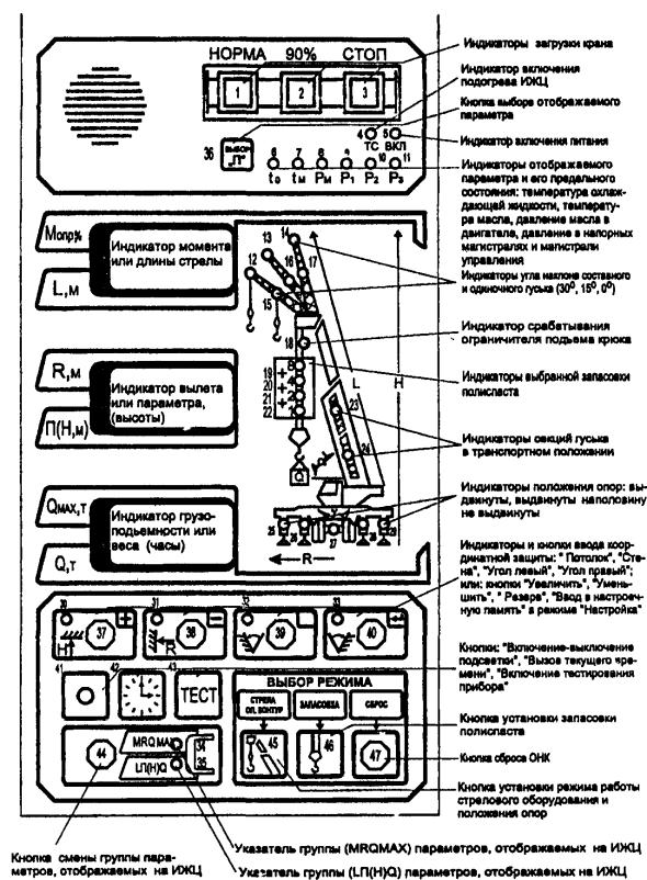 момента, создаваемого стрелой без груза, если Мопр о величине вылета крюка R, м; о фактической массе поднимаемого груза Q, т; о длине стрелы L, м; о высоте подъема оголовка стрелы H, м; о максимальной грузоподъемности Qmax, т, на данном вылете R, м; об угле поворота платформы γ, градусы; об угле наклона стрелы относительно горизонта a, градусы; о температуре охлаждающей жидкости двигателя, °С; о давлении масла в двигателе, атм; о температуре масла в гидросистеме, °С; о величинах трех давлений в гидросистеме крана, атм. 1.2.2. Прибор сигнализирует: зеленым индикатором "Норма" - о нормальном режиме работы крана; желтым или зеленым индикатором "90 %" и прерывистым звуковым сигналом - о том, что кран загружен не менее чем на 90 % и/или о выходе за пределы допуска хотя бы одного параметра двигателя и гидросистемы (с одновременным миганием единичного индикатора, отвечающего за этот параметр); красным индикатором "Стоп", прерывистым звуковым сигналом (и отключает механизмы крана) - о превышении допустимого значения грузового момента, заложенного в программу на любом из режимов его работы; красным индикатором - о срабатывании концевого выключателя механизма подъема крюка; красным индикатором - о срабатывании обогревателя (термостата) прибора; красным индикатором - о наличии на приборе напряжения +5 В; красными индикаторами - о выбранных крановщиком для работы стреловом оборудовании, опорном контуре и схеме запасовки грузового каната; красными индикаторами - о выходе параметров двигателя и гидросистемы за установленные пределы; включением соответствующих индикаторов (постоянным свечением) - о введении режима координатной защиты (по числу введенных ограничений); красным индикатором "Стоп", прерывистым звуковым сигналом, отключает механизмы крана и дополнительно включает мигающим светом соответствующие светодиоды по числу введенных ограничений без отключения лампы зеленого света - при достижении заданных ограничений «Стена», «Потолок», «Поворот вправо», «Поворот влево» (координатная защита). Программно-аппаратные средства ограничителя обеспечивают проверку исправности основных его узлов, линий связи с датчиками и локализуют неисправность путем выдачи на индикатор кода неисправности. Прибор предназначен для работы в следующих условиях: при изменении температуры окружающей среды от -45 до +55 °С; при относительной влажности воздуха до 98 % при температуре +25 °С. Степень защиты корпуса прибора в соответствии с ГОСТ 14254-96 «Изделия электротехнические. Оболочки. Степени защиты»: IР50 - для блоков; IР55 - для датчиков. Диапазоны измерения и допустимые изменения значений основных параметров и характеристик, а также основные технические данные, не указанные выше, которые должен обеспечивать прибор: Диапазон измерения: угла поворота платформы, градусы.................................................................. 15-345 давлений в гидросистеме, МПа........................................................................ 0,1-40 угла наклона стрелы, градусы........................................................................ От -8 до +98 приращения длины стрелы, м...................................................................... 1-18 или 1-26 температуры, °С........................................................................................... От -40 до +100 давления масла в двигателе, МПа..................................................................... 0-1,5 Погрешность отображения информации на индикаторах в статическом режиме, %, не более: о степени загрузки кра