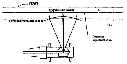 3.3.5. Ввод координатной защиты. Для ввода ограничения необходимо нажать не менее чем на 1 с одну из кнопок 37-40 (при необходимости поочередно несколько кнопок) напротив символа, обозначающего тип требуемой защиты (например, «Потолок»); при этом должен включиться индикатор введенного ограничения. При вводе координатной защиты в случае срабатывания МЗОН (код Е 11) необходимо удерживать в нажатом положении до ввода первого ограничения кнопку 41 (включение подсветки). Для снятия введенного ограничения (сброса защиты) необходимо повторно нажать ту же кнопку и проконтролировать выключение соответствующего индикатора. Горение индикаторов постоянным свечением свидетельствует об отсутствии срабатывания защиты по введенным ограничениям. Рис. 5. Ввод ограничения типа «ЛЭП» («Стена») При достижении в процессе работы крана любого из введенных ограничений срабатывает координатная защита, загорается красный индикатор (зеленый продолжает гореть), включается звуковой сигнал, индикатор ограничения, из-за которого сработала защита, переводится в мигающий режим. Для отключения защиты крановщик должен изменить параметр, по которому достигнуто ограничение. Например, при достижении ограничения «Потолок» необходимо либо опустить стрелу, либо уменьшить ее длину. Внимание! При вводе ограничений координатной защиты необходимо предусматривать запас по расстоянию и углу поворота (для учета инерции крана при приближении к зоне, в которой работа крана запрещена). При приближении к установленному ограничению звуковой сигнал начинает звучать раньше, чем наступает ограничение. 3.3.5.1. Ввод ограничения «Стена». Ограничение «ЛЭП» («Стена») - это воображаемая вертикальная бесконечная плоскость, перпендикулярная проекции стрелы на землю и построенная по срезу оголовка стрелы. Ограничение «ЛЭП» («Стена») вводится в следующей последовательности: провести (см. рис. 5) воображаемую ограничительную линию, параллельную охранной зоне объекта и отстоящую от него не менее чем на 1 м, которую не должен пересекать крюк крана. При этом расстояние между границей охранной зоны и ограничительной линией должно быть таким, чтобы при срабатывании ограничителя стрела (с учетом инерционного пролета крана и габаритов груза) не приближалась к границе охранной зоны объекта менее чем на 0,5 м; установить стрелу перпендикулярно ограничительной линии; изменяя при необходимости длину стрелы или угол наклона, добиться касания крюком ограничительной линии (не пересекая ее) в точке 3; нажать на 1 с кнопку ввода ограничения «ЛЭП» (на приборе индикатор «Стена»). Загорание индикатора «ЛЭП» (на приборе индикатор «Стена») свидетельствует о вводе ограничения в память прибора; проверить правильность срабатывания защиты ограничителя, для чего: повернуть кран без изменения вылета влево на произвольный угол по отношению к точке ввода ограничения «ЛЭП» («Стена»); увеличить вылет (изменением угла наклона или длины стрелы) в направлении ограничительной линии, проконтролировать срабатывание защиты (включение красного индикатора, звукового сигнала и перехода индикатора «Стена» в мигающий режим) в момент, когда проекция оголовка стрелы (крюк) пересекает ограничительную линию в точке 1; уменьшить вылет и повернуть стрелу вправо на произвольный угол по отношению к точке ввода ограничения; увел