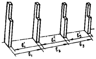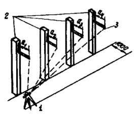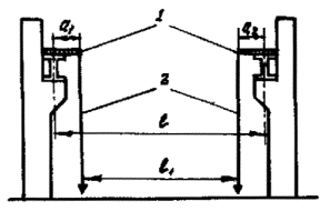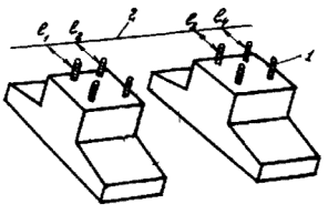 расстояния от проволоки Из двух полученных размеров вычисляют средний, который и принимают за фактическое расстояние между смонтированными элементами. 2.32. При монтаже сборных фундаментов с установленными анкерными болтами точность установки таких фундаментов проверяют не по граням, а по расположению анкерных болтов. Проектное положение анкерных болтов измеряют теодолитом и линейкой или проволокой, натянутой параллельно основной разбивочной оси, и линейкой (рис. 12). Аналогичным способом проверяют правильность установки анкерных болтов в монолитные фундаменты. 2.33. Вертикальность отдельно стоящей колонны проверяют теодолитом, который устанавливают в двух взаимно перпендикулярных направлениях (по цифровой и буквенной осям). Для проверки вертикальности и планового расположения (по продольной оси) ряда смонтированных колонн можно применять схему, описанную в п. 2.32 или схему, приведенную на рис. 13. Рис. 13. Проверка вертикальности установки ряда колонн: 1 - теодолит; 2 - колонны; 3 - линейка; а1 - а4 - расстояния от грани колонн до коллимационной плоскости теодолита Рис. 14. Проверка расстояний между осями подкрановых балок (рельсов): 1 - линейка-консоль; 2 - отвесы; l - расстояние между осями подкрановых балок; l1 - расстояние между отвесами 2.34. Высотные отметки дна котлованов, опорных плоскостей фундаментов, консолей, опорных площадок, оголовки колонн и других опорных конструкций определяют при помощи теодолита-нивелира (или нивелира) и рейки. При нивелировании подошвы фундамента рейку устанавливают в 4-5 точках (по углам и в центре контура), а при нивелировании опорной площадки фундамента для металлических колонн - по четырем углам и в основании анкерных болтов, для железобетонных - на днище стакана. 2.35. Нивелирование подкрановых балок и рельсов целесообразно выполнять при помощи гидростатического уровня. Параллельность и расстояние между подкрановыми балками и рельсами следует проверить методом непосредственных линейных измерений. В отдельных случаях расстояние между подкрановыми путями измеряют при помощи отвесов. Для этой цели перпендикулярно направлению осей пути прикрепляют линейки в виде консолей, к концам которых подвешивают грузы (рис. 14). Расстояние между осями подкрановых рельсов определяют по следующей математической зависимости: l = l1 + a1 + a2, (15) где l - расстояние между осями рельсов; l1 - расстояние между отвесами; a1, a2 - отсчеты по линейкам. 2.36. Расстояния между смонтированными балками, ригелями и фермами покрытий измеряют металлическими рулетками, а их вертикальность - отвесом. Расстояния между опорными узлами двух соседних элементов (конструкций) на каждой из опор измеряют прямым и обратным замерами (рис. 15). Рис. 15. Схема замеров расстояний между смонтированными балками (фермами): l1 - l3 -