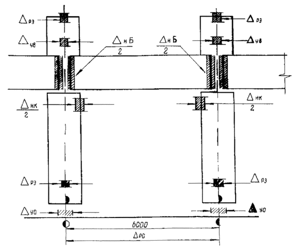 В общем случае величина суммарного допуска моет быть определена по формуле Di - проекции изготовленных, разбивочных и установочных (элементарных) допусков на ось замыкающего звена размерной цепи. 1.7. Изготовительный допуск (Dи) определяет отклонения габаритных размеров конструкций, элементов и изделий от их проектных величин при изготовлении и принимается по таблицам 5 и 6 приложения 1. На величину изготовительного допуска (Dи) влияет ряд факторов; основные из них: точность габаритных размеров формующего оборудования (форм, опалубки, кондукторов, копиров, стендов); изменчивость габаритных размеров формующего оборудования в процессе его эксплуатации; отклонения технологических процессов изготовления сборных элементов, изделий и конструкций от нормали; качество исходных строительных материалов и полуфабрикатов, серийность выпуска изделий; точность установки закладных деталей, монтажных болтов, отверстий и других элементов, центрирующих и закрепляющих изделие при его монтаже; точность нанесения монтажных осей, способы их обозначения на поверхностях готовых изделий; точность измерительных приборов и инструментов, а также методы метрологических работ при контроле качества изделий; вид технического контроля качества выполнения производственных процессов и операций (пооперационный, выборочный, систематический и другие). 1.8. Допуски на разбивку (Dр) и установку (Dу) сборных строительных конструкций определяют точность строительно-монтажных работ на площадке. Эти два допуска при суммировании квадратически образуют монтажный допуск (Dм). Величина монтажного допуска (Dм) зависит от: точности геодезических и измерительных приборов, инструментов и приспособлений, применяемых при разбивке как сооружения в целом, так и его отдельных конструктивных элементов, блоков и секций; точности производства измерений (линейных, угловых, высотных) при разбивке и установке элементов и конструкций в проектное положение; методов разбивки и способов нанесения разбивочных монтажных осей (основных базовых и промежуточных, вертикальных и горизонтальных); методов монтажа сборных конструкций; схемы последовательности установки элементов; способов временного закрепления, выверки и постоянного закрепления конструкций и их элементов; методов контроля за установкой конструкций в проектное положение. Существенное влияние на точность монтажа сборных строительных конструкций оказывают применяемые монтажные приспособления (кондукторы, фиксаторы, связи), квалификация исполнителей, воздействие внешних климатических условий строительной площадки, неравномерная осадка грунтов в основании сооружений в период монтажа, остаточные деформации и другие дефекты конструкций и их элементов, возникающие в период транспортирования готовых изделий с заводов-изготовителей и при их хранении на приобъектном складе. 1.9. Для определения величины монтажного допуска (Dм) при проектировании конструкций квадратически суммируют следующие допуски: Dро - допуск осевых разбивочных pазмеpoв, который принимают по табл.7 приложения 2, зависит от расстояния между устанавливаемыми элементами; Dру - допуск на отклонения отметок уровенных маяков и вертикальных отметок опорных площадок принимают по табл.8 приложения 2; Dуо - допуск на несовмещение осей элемента с осями, разби