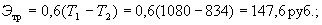 где 0,6 - сумма накладных расходов, приходящаяся на 1 чел.-день, руб.; Т1, Т2 - трудоемкость работ соответственно по эталону и новому варианту, чел.-дни.