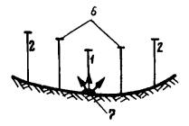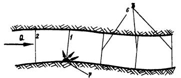 а - с дополнительной подпиткой из водотока и возвратом воды в карьер, б - без подпитки, с возвратом воды в карьер, в - с возвратом отработанной воды насосной станцией откачки в карьер; 1 - земснаряд; 2 - пульпопровод; 3 - насосная станция откачки; 4 - зумпф; 5 - водосбросный колодец; 6 - сброс осветленной воды; 7 - насосная станция подпитки; 8 - прудок-отстойник; 9 - гидромонитор; 10 - земустановка Черт. 1 (а, б, в) Водоснабжение с выпуском осветленных сбросных вод гидромеханизации в природный водоем (водосток) 1 - земснаряд; 2 - магистральный пульпопровод; 3 - прудок-отстойник; 4 - вторичный отстойник; 5 - водосбросный колодец; 6 - водосбросная канава; 7 - выпуск осветленной воды Черт. 2 Приложение 7Обязательное Определение состояния водной среды в районе производства гидромеханизированных работ1. Предельно-допустимый сброс (ПДС) осветленных вод гидромеханизации за пределы карты намыва рекомендуется определять по Методике ВНИИВО (Методические указания по применению Правил охраны поверхностных вод от загрязнения сточными водами, 1982). Используемая схема водоснабжения производства гидромеханизированных работ должна отвечать экологическим требованиям смежных водопользователей. Требования к условиям выпуска сбросных вод гидромеханизации в природный водоприемник и необходимой степени их осветления на границе пункта водопользования (хозяйственно-питьевого, рыбохозяйственного) определяются зависимостями где Ссвг, Сфон, СПДК - концентрация загрязнений в сбросных водах гидромеханизации, фоновая концентрация и концентрация загрязнений на уровне ПДК, мг/л; Q и q - значение расходов воды в природном водостоке и сбросных вод гидромеханизации за расчетный период, м3/с; а - коэффициент обеспеченности смещения, определяемый по формуле (3)