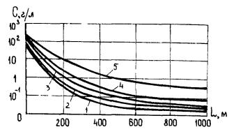 где U - средняя скорость течения, м/с; H - средняя глубина реки, м; e - основание натурального логарифма; a - коэффициент, учитывающий гидравлические факторы смещения; Lф - расстояние от места выпуска сбросных вод гидромеханизации до контрольного створа по течению реки по фарватеру, м; x - коэффициент, зависящий от места выпуска сбросных вод гидромеханизации в реку (x = 1 при выпуске у берега и x = 1,5 при выпуске на стрежне); j - коэффициент извилистости реки, j= L/Lп; Lп - расстояние от места выпуска до контрольного створа по прямой, м; D - коэффициент турбулентной диффузии, м2/c. На основе зависимостей (1) и (2) определяется ПДС загрязняющих веществ ПДС = q×Cсвг = const, кг/сут. положенный в основу проектирования производства гидромеханизированных работ и являющийся контрольным параметром в период строительства. 2. Определение степени осветления сбросных вод гидромеханизации: а) концентрация взвеси на пляже намыва определяется по графику (черт. 1). Распределение концентрации взвеси по длине откоса при торцевом способе намыва с расходом пульпы от 1000 до 5000 м3/ч и консистенцией на выпуске 1:10 При содержании в твердой составляющей пульпы песчаных частиц d> 0,05 мм более 90% и глинистых d£0,005 мм менее 1% с расходом пульпы на выпуске 1000 (1), 2000 (2), 3000 (3), 4000 (4), 5000 (5) м3/ч При содержании в твердой составляющей пульпы глинистых частиц d£0,005 мм менее 20% (1) и менее 44% (2) с расходом пульпы на выпуске от 1000 до 5000 м3/ч Черт. 1 Размеры прудка-отстойника определяются исходя из сброса фракций грунта d£0,05 мм. Начальный объем должен быть не меньше двухсуточного объема воды, поступающего при возведении намывного сооружения в составе пульпы. Концентрация взвеси в прудке на водосбросе (шандорном колодце) Ссвг определяется по зависимости (4)