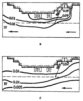Примечание. S, B, L - средняя площадь (м2), ширина и длина (м) зоны загрязненности. Условия смежных водопользователей выполняются при выпуске сбросных вод гидромеханизации с расходом q = 49920 м3/сут и концентрацией взвеси на водосборе Ссвг = 0,4 г/л, ПДС = 19968 кг/сут. Размеры прудка-отстойника должны быть не менее 200´750´1 м. Результаты расчета распространения взвеси Ссвг (г/л) в прибрежной акватории при работе берегового гидроотвала а - q1 = 49920 м3/сут, Ссвг = 6 г/л; б - q2 = 49920 м3/сут, Ссвг = 0,28 г/л; I - гидроотвал; II - насосная станция производственного водоснабжения (СПДК = 0,9 г/л); III - поселковый пляж (СПДК = 0,02 г/л); IV - район рыболовства (СПДК = 0,01 г/л); СПДК - предельно-допустимая концентрация взвешенных веществ в акватории для отдельных категорий водопользователей; стрелками показано направление течения, пунктирами - границы районов водопользования Черт. 3 Приложение 8Рекомендуемое Удельные нормы суточного накопления подсланевых вод