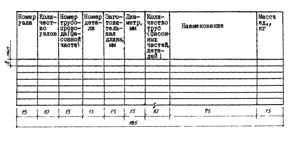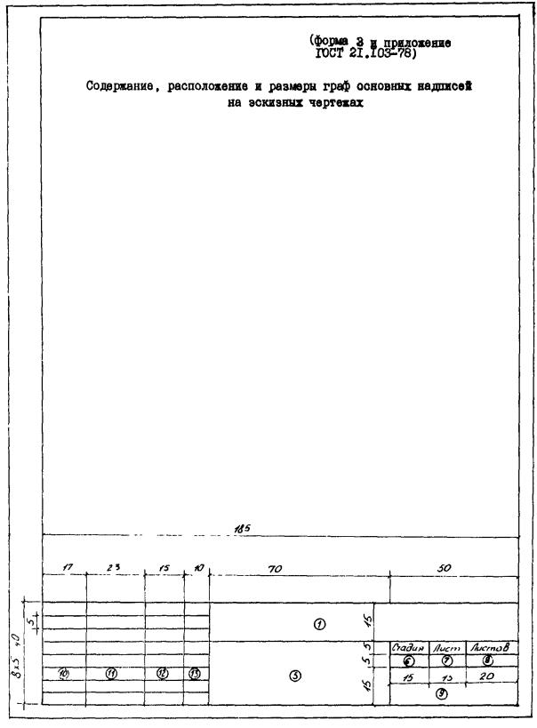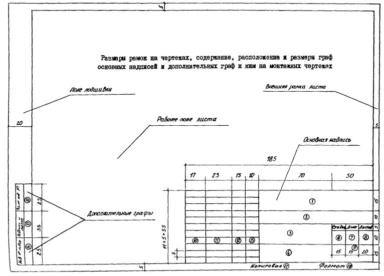 1.4. Монтажные чертежи выполняют, как правило, на одинаковых форматах листов в соответствии о ГОСТ 2.301-68*. Рекомендуемые размеры сторон форматов - 210´297 и 420´297 мм. 1.5. Размеры рамок на монтажных чертежах, содержание, расположение и размеры граф основных надписей и дополнительных граф к ним должны соответствовать форме 1 и приложению ГОСТ 21.103-78 (приложение 1), а на эскизных чертежах - форме 3 и приложению ГОСТ 21.103-78 (приложение 2). В графах основных надписей и в дополнительных графах (номера граф показаны в кружках) указывают: в графе 1 - обозначение документа (в левом углу графы) и номер заказа на изготовление узлов и деталей из труб на заводе монтажных заготовок (в правом углу). При разработке монтажных (эскизных) чертежей специализированной проектной организацией номер заказа (в правом углу графы 1) не заполняется; в графе 2 - наименование предприятия, в состав которого входит здание (сооружение); в графе 3 - наименование здания; в графах 4 и 5 - наименование изобретений, помещенных на данном листе, в точном соответствии с наименованием, указанным над изобретением на поле чертежа (спецификации и другие таблицы, а также текстовые указания, относящиеся к изобретениям, в графе не указывают); в графе 6 - условное обозначение стадии проектирования (МЧ - монтажные чертежи, ЭЧ - эскизные чертежи); в графе 7 - порядковый номер листа данного комплекта монтажных (эскизных) чертежей; в графе 8 - общее количество листов комплекта; в графе 9 - наименование организации, разрабатывающей чертежи; в графах 10-13 - должности, фамилии, подписи исполнителей, утверждающего и других лиц, ответственных за содержание документа, даты подписания документа; в графе 14 - инвентарный номер подлинника; в графе 15 - подпись лица, принявшего подлинник на хранение, и дату приемки; в графе 16 - инвентарный номер подлинника, взамен которого выпущен данный подлинник; в графе 17 - подпись лица, копировавшего чертеж; в графе 18 - обозначение формата по ГОСТ 2.301-68*. 1.6. Специализированная проектная организация, разработавшая монтажные (эскизные) чертежи, передает их заказчику (монтажному управлению, тресту) на утверждение в установленные договором сроки в четырех экземплярах (два - сброшюрованных и два - россыпью). Количество экземпляров (сброшюрованных и россыпью) может быть уточнено в задании. При отсутствии замечаний монтажные (эскизные) чертежи считаются утвержденными, а при их наличии - подлежат доработке. Лица, разработавшие монтажные (эскизные) чертежи, несут ответственность за качество выполненной документации в установленном порядке. При разработке монтажных (эскизных) чертежей монтажными организациями (управлениями, трестами) их утверждение и доработка осуществляются в порядке, установленном для данных организаций. 2. ОБЩИЕ ДАННЫЕ2.1. Общие данные, входящие в каждый комплект монтажных (эскизных) чертежей, допускается размещать на нескольких листах, при этом в основных надписях после наименования листа "Общие данные" записывают: на первом листе - "(Начало)", на последующих листах - "(Продолжение)", а на последнем листе - "(Окончание)". 2.2. В состав общих данных монтажных (эскизных) чертежей включают: ведомость комплектов монтажных (эскизных) чертежей; ведомость монтажных (эскизных) чертежей комплекта; сводную спецификацию; комплектовочную ведомость узлов (блоков, деталей); общие указания; условные 