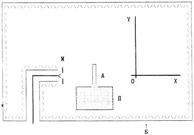 А - испытываемая антенна; И - измерительная антенна; П - пенопластовая подставка; Б - безэховая камера. |