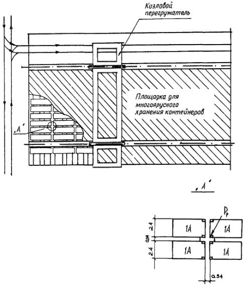 Примечания: 1. В числителе - значения нагрузки, передаваемой на фитинг контейнера типа 1А ГОСТ 20259-80, в знаменателе - типа 1С. 2. Расчетное давление - результат деления расчетной нагрузки на площадь круга, равновеликого площади фитинга. 3. Диаметр Dp площади круга, равновеликого площади фитинга (0,0225 м2), равен 0,17 м. 3. МАТЕРИАЛЫ ДЛЯ ЖЕСТКИХ ПОКРЫТИЙ ПОРТОВЫХ ТЕРРИТОРИЙ3.1. Бетон 3.1.1. Для устройства покрытий специализированных комплексов портовых контейнерных терминалов применяют тяжелые бетоны, отвечающие требованиям соответствующих ГОСТов. 3.1.2. Основным контролируемым показателем качества бетона жестких покрытий является прочность на сжатие, определяемая в проектном возрасте. По прочности на сжатие следует применять бетон: - класса В30 для монолитных цементобетонных покрытий; - класса В27,5 для монолитных и сборных железобетонных покрытий. Прочность бетона на сжатие, растяжение при изгибе и другие механические характеристики, а также марки по морозостойкости приведены в обязательном приложении 6. 3.2. Арматура 3.2.1. Для армирования монолитных железобетонных покрытий и сборных покрытий из плит с ненапрягаемой арматурой следует применять арматуру в соответствии с СНиП 2.03.01-84 «Бетонные и железобетонные конструкции», СНиП 2.03.11-85 «Защита строительных конструкций от коррозии», действующими ГОСТами и техническими условиями. Рис. 1. Схемы нагрузок КВ-70 и КВ-35 Рис. 2. Схема расстановки контейнеров на складской площадке для их хранения Нормативные и расчетные характеристики арматуры следует принимать в соответствии с указаниями СНиП 2.03.01-84. 4. МАТЕРИАЛЫ ДЛЯ УСТРОЙСТВА ОСНОВАНИЙ ЖЕСТКИХ ПОКРЫТИЙ ПОРТОВЫХ ТЕРРИТОРИЙ4.1. Верхние слои основания 4.1.1. Для верхних слоев основания следует использовать: каменные материалы 1 - 3-го классов прочности, уложенные по способу заклинки; щебень, гравий, песчано-гравийные смеси; грунты, укрепленные цементом, активной золой уноса, известью, фосфатными и другими вяжущими; однородные по качеству активные гранулированные шлаки с подобранным гранулометрическим составом. В особо сложных случаях, например при устройстве покрытий на намывных или насыпных грунтах, подстилаемых естественными слабыми грунтами, необходимость устройства дополнительных слоев определяют на основании технико-экономических расчетов. 4.2. Грунтовое основание 4.2.1. Для устройства грунтового основания надводной части территории следует использовать грунты, соответствующие требованиям СНиП 2.05.02-85 «Автомобильные дороги» и СН 449-72 «Указания по проектированию земляного полотна железных и автомобильных дорог». 4.2.2. Требуемая степень уплотнения грунтового основания, характеризуемая коэффициентом уплотнения грунта, равным отношению плотности скелета грунта в основании к максимальной плотности того же грунта при стандартном уплотнении, назначается по ГОСТ 22733-77 и в соответствии с таблицей обязательного приложения 3. 4.2.3. Используемые в расчетах покрытий механические характеристики песчаных грунтов следует назначать в соответствии с указаниями, приведенными в справочном приложении 4. 5. КОНСТРУИРОВАНИЕ ЖЕСТКИХ ПОКРЫТИЙ5.1. Технические требования 5.1.1. Конструирование покрытий необходимо осуществлять с учетом анализа величин и характера приложения нагрузок (подвижной или статической), климатических и гидрогеологических условий строительств