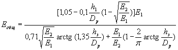 Рис. 3. Номограмма для определения максимальных растягивающих напряжений при изгибе неограниченной в плане плиты на упругом двухслойном основании (hб/Dр = 0,20 ¸ 0,60): 1 - бетонное покрытие; Еб, mб, hб - соответственно модуль упругости, коэффициент Пуассона, толщина бетонного покрытия; 2 - верхний слой основания; Ео, mо, hо - соответственно модуль упругости, коэффициент Пуассона, толщина слоя; 3 - многослойное основание; Еобщ, Мобщ - соответственно модуль упругости, коэффициент (общий) Пуассона основания