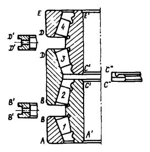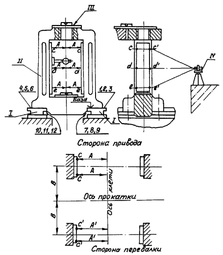I - плитовины; II - станины клети; III - поверочная линейка и уровень, IV - теодолит; сс¢; дд¢; ее¢ - точки измерения; А, А¢ - результаты измерения; 1-12 - точки проверки щупом прилегания станин к плитовинам
