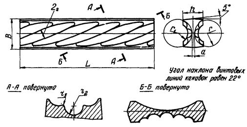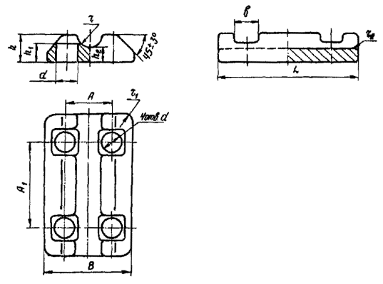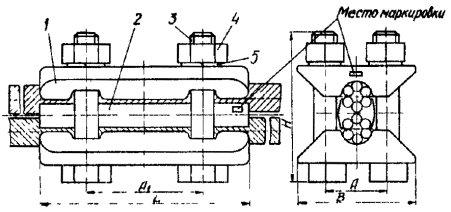 Рис. 1. Разъемные зажимы: А - для сращивания канатов, Б - для закрепления каната с образованием петли; 1 - рабочая ветвь каната расчалки; 2 - свободная ветвь каната; 3 - бухта каната; 4 - инвентарный канат (отрезок каната расчалки) 2. ТРЕБОВАНИЯ К ЗАЖИМУ2.1. Зажим должен исключать скольжение ветвей каната: в закреплении «А» (см. рис. 1) - при испытательной нагрузке меньше 0,7 от разрывного усилия каната в целом; в закреплении «Б» (см. рис. 1) - при испытательной нагрузке меньше 0,8 от разрывного усилия каната в целом. 2.2. Зажимы должны быть установлены на чистые, лишенные пластической деформации, участки стальных канатов. 2.3. Закручивание гаек зажимов следует производить динамометрическими ключами или гайковертами для получения заданных величин крутящих моментов, исключающих пластическое деформирование прядей каната и обеспечивающих необходимое прижатие ветвей каната к профильным поверхностям вкладыша. Допускается закручивание гаек обычными гаечными ключами с последующей проверкой величины крутящего момента динамометрическим ключом. 3. КОНСТРУКЦИЯ И СБОРКА ЗАЖИМА3.1. Разъемный зажим (рис. 2 и табл. 1) состоит не двух накладок с внутренним цилиндрическим гладким пазом, стягиваемых болтами, и вкладыша, на двух противоположных сторонах которого выполнены профильные поверхности, соответствующие наружной поверхности каната. При стягивании накладок болтами обеспечивается совпадение и плотное прилегание профильных поверхностей ветвей каната и вкладыша. 3.2. Конструкция и размеры накладок 1 зажима (см. рис. 2) должны соответствовать указанным на рис. 3 и в табл. 2. 3.3. Конструкция и размеры болтов, гаек и пружинных шайб принимаются в соответствии с табл. 1. 3.4. Конструкция и размеры профильного вкладыша 2 (рис. 2) должны соответствовать указанным на рис. 4 и в табл. 3. Вкладыш получают из пластины размерами: ширина ее меньше В (см. рис. 4) на 2 мм, а толщина меньше h (см. рис. 4) на 1 мм. Рис. 2. Разъемный зажим с профильным вкладышем: 1 - накладка; 2 - вкладыш; 3 - болт; 4 - гайка; 5 - шайба 3.5. При оборке зажима ветви каната устанавливаются относительно профильного вкладыша в произвольное положение. С помощью накладок, сжимаемых болтами и гайками, ветви каната упруго деформируются и за счет этого сопрягаются с вкладышем. 3.6. Усилие сжатия ветвей каната определяется количеством болтов зажима, их диаметром и величиной крутящего момента, передаваемого на каждый болт. Соотношение диаметров болтов и величин крутящего момента, необходимых для надежного закрепления каната, даны в табл. 4. Таблица 1
