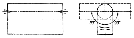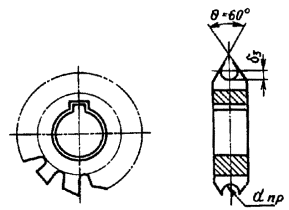 4. ТРЕБОВАНИЯ К ДЕТАЛЯМ ЗАЖИМА4.1. Детали зажима должны изготовиться в соответствии с чертежами, представленными в разделе 3. 4.2. Детали зажима должны изготовляться из материалов: накладка - отливкой из стали марки 25-Л-II по ГОСТ 977-66. Продельные отклонения размеров отливок III класса точности - по ГОСТ 2009-55; профильный вкладыш - штамповкой из стали марки ВМст 3кп по ГОСТ 380-71; болты, гайки, шайбы - см. табл. 1. 5. ТЕХНОЛОГИЯ ИЗГОТОВЛЕНИЯ ПРОФИЛЬНЫХ ВКЛАДЫШЕЙ5.1. Профильный вкладыш изготовляют в специальном штампе, конструкция которого разработана СКБ ВНИИмонтажспецстроя. Схема штамповки представлена на рис. 5. 5.2. Профильные поверхности пуансона и матрицы получают обработкой заготовок на горизонтально-фрезерном станке с помощью делительной головки и дисковой фрезы (рис. 6) размерами по табл. 5. Стол станка о закрепленной заготовкой пуансона или матрицы поворачивается относительно плоскости фрезы на угол 22° (рис. 7), соответствующий среднему углу свивки прядей в канат. При отклонении угла свивки каната от среднего значения более чем на 3° следует изменить угол наклона канавок на пуансоне и матрице. Рис. 5. Схема штамповки профильного вкладыша: 1 - пуансон; 2 - заготовка вкладыша; 3 - матрица Рис. 6. Дисковая фреза: dз - глубина зуба; dпр - диаметр профиля зуба; q - угол заточки фрезы Рис. 7. Схема установки заготовки пуансона на станке для нарезания профильной поверхности: 1 - заготовка; 2 - дисковая фреза, 3 - делительная головка; 4 - горизонтальный стол; 5 - державка фрезерного станка Рис. 8. Схема качательного движения заготовки 5.3. При нарезке каждого выступа на пуансоне и матрице их заготовке сообщают качательное движение по рис. 8. Таблица 5