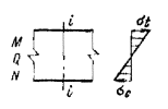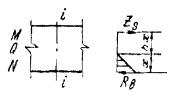 Критерии прочности в соответствии с п. 1.2 glcgnsmc £ gbRb; 1,0×1,25×7,94 = 9,9 МПа < 0,9×11,5 = 10,35 МПа; glcgnsmt £ gbRbt; 1,0×1,25×0,62 = 0,77 МПа < 0,9×0,9 = 0,81 МПа. Условия прочности удовлетворяются. В зоне действия главных растягивающих напряжений рекомендуется поставить конструктивную арматуру 4Æ20 A-II на 1 м длины. Пример 9. Дано. В сечении i-i высотой h = 3,0 м конструкции докового типа (рис. 8) энергетического сооружения (gс = 1,0) II класса (gn = 1,2), изготовленной из бетона класса В20 (Rb = 11,5 МПа, Rbt = 0,9 МПа), при основном сочетании нагрузки (glc = 1,0) имеют место усилия: М = 0,80 МН×м; Nc = 0,90 МН; Q = 0,80 MH. Требуется установить возможность изготовления данной конструкции бетонной (gb = 0,9) без установки рабочей арматуры. Расчет. Проверяем условие прочности растянутого волокна. Для бетона класса В20 с = 6,7 см. При h = 300 см и