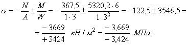 С учетом противодавления в сечении I-I: Nc = 117,5 - 24,5 = 93 кН; М = 204,5 + 24,5 (0,5 - 0,33) = 208,7 кН×м. Рис. 1. К примеру расчета 1 Принимаем As = 0; Ared = A = 1×1 = м2; Wred = 1×12/6 = 0,167 м3, тогда s = - N/A ± M/W = - 93/1 ± 208,7/0,167 = -93 ± 1250 = -1343/1157 кН/м2 = - 1,343/1,157 МПа;