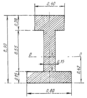 1,20×1,0×0,06 < 1×0,9×1,275×1,20×0,0533; 0,0720 < 0,0735. Условие прочности плиты соблюдается, поэтому окончательно принимаем для его изготовления бетон класса В30. Пример 3. Дано. В бетонной балке (gb = 0,9) двутаврового поперечного сечения (рис. 4), изготовленной из бетона класса В30 (Rbt = 1,2 МПа, Rb = 17 МПа) и являющейся элементом энергетического сооружения II класса (gс = 1,0; gп = 1,20), при действии нагрузок основного сочетания (glc = 1,0) возникают изгибающий момент М= 0,055 МН×м (5,61 тс×м) и перерезывающая сила Q = 0,06 МН (6,12 тc). Требуется проверить прочность балки. Расчет. Определим вначале геометрические характеристики сечения. А = A1 + A2 + A3 = 0,4×0,2 + 0,15×0,55 + 0,60×0,15 = 0,2525 м2; Рис. 4. К примеру расчета 3. Размеры, м. S = A1y1 + A2y2 + A3у3 = 0,08×0,80 + 0,0825×0,425 + 0,09×0,075 = 0,106 м3;