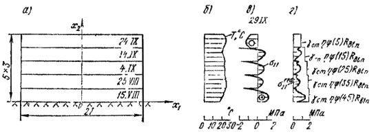 glcgnsmt = 1,0×1,2×0,23 = 0,276 МПа < gсgb4gb5Rbt = 1,0×0,9×0,81×0,9 = 0,656 МПа. Условия прочности сечения i-i по главным растягивающим напряжениям также выполняются со значительным запасом/ Следовательно, сечение i-i можно принять бетонным. Пример 10. Дано. В сечениях I-I, II-II,… V-V бетонной конструкции водосброса (gb = 0,9) энергетического сооружения (gс = 1,0) методом конечных элементов определены краевые значения главных сжимающих напряжений smc, МПа (рис. 9). Напряжения по сечениям изменяются практически по линейному закону. Класс сооружения I (gn = 1,25); сочетание нагрузок основное (glс = 1,0). Требуется определить необходимую марку бетона по прочности на сжатие. Рис. 9. К примеру расчета 10. Размеры, м Расчет. Наибольшее значение главных сжимающих напряжений smc = 10,5 МПа имеет место в сечении III-III. Углы наклона граней qi меньше 10° и ими можно пренебречь. Решив уравнение (12) относительно Rb, получим
