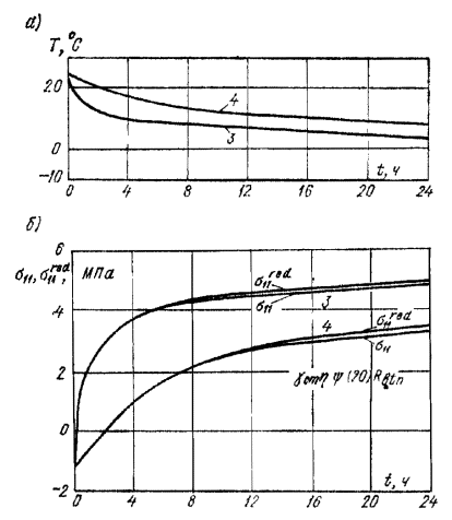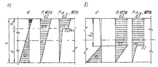 Ближайшее к полученному значению расчетное сопротивление бетона осевому растяжению Rbt = 0,75 МПа соответствует классу бетона В15. Этот класс бетона может быть принят для изготовления рассматриваемой конструкции. Проверим соответствие выбранного класса бетона прочности сжатой зоны сечения I-I в предположении наличия трещин в растянутой зоне. Проверку осуществляем по формуле (14) настоящего Пособия 1,0×1,2×1,5 = 1,8 МН < 1,5×1×0,9 (0,5 - 0,3)×8,5×2×1 = 4,59 MH. Условие прочности сжатой зоны сечения I-I выполнено со значительным запасом даже в предположении появления трещин в растянутой зоне. Пример 6. Дано. Конструкция энергетического сооружения, аналогичная рассмотренной в примере 5 (высота сечения h = 2 м). Отличие состоит в том, что боковое давление интенсивностью р = 0,3 МПа создается давлением воды на наружные грани (gb = 0,9). Требуется оценить возможность возведения конструкции, из класса В15 без армирования. Рис. 6. К примеру расчета 6 а, б - соответственно первый и второй этапы расчета. Размеры, м. Экспериментальными исследованиями установлено, что для производственного состава бетона класса В15 коэффициент эффективной площади противодавления следует принять равным: a2b = 1,0 - в пределах растянутой зоны сечения и в пределах трещины; a2b = 0,3 - в пределах сжатой зоны сечения. Рассмотрим сечение I-I (см. рис. 5). В этом сечении от действия гидростатического давления воды возникают усилия: N = 1,5MH; М = 0,9 МН×м (см. пример 5). Рассматриваемое сечение является внецентренно сжатым с эксцентриситетом еo = 0,6 м. Высота растянутой зоны сечения ht = 0,445 м; х = 1,55 м. Так как элемент подвержен давлению воды, следует уточнить возникающие в нем усилия путем учета противодавления в расчетных сечениях. Вначале конструкцию рассматриваем как трещиностойкую. Усилие противодавления в ней определяем в соответствии с указанием п. 1.8 Пособия. Эпюру гидростатического давления принимаем изменяющейся по линейному закону от р¢ = 0,3 МПа - на наружной грани, до р" = 0 - на внутренней грани (рис. 6, а). На нейтральной оси р = 0,234 МПа. Усилия в сечении I-I от действия противодавления равны: