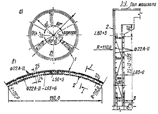 glcgnsmt = 1,0×1,2×0,883 = 1,06 МПа = gcgb4gb5Rbt = 1,0×0,9×0,98×1,2 = 1,06 МПа. Условие прочности по главным растягивающим напряжениям на уровне верхней грани растянутой полки также выполняется. Пример 4. Дано. Бетонная конструкция башенного типа энергетического сооружения (gс = 1,0) II класса (gn = 1,20), горизонтальное сечение которой представлено на рис. 5, изготовлена из бетона класса В15 (Rb = 8,5 МПа, Rbt = 0,75 МПа), при основном сочетании нагрузок (glс = 1,0) воспринимает равномерное боковое давление интенсивностью q = 0,252 МПа (боковое давление грунта qн = 0,210 МПа, gf = l,2 - коэффициент надежности по нагрузке). Элемент не подвержен действию агрессивной воды и не воспринимает напор воды. Трещины в растянутых зонах элемента допускаются. Требуется проверить прочность сечения I-I. Расчет. Статический расчет выполняем для 1 м длины элемента (b = 1 м). Из статического расчета элемента как рамы с жесткими вставками находим для сечения I-I: