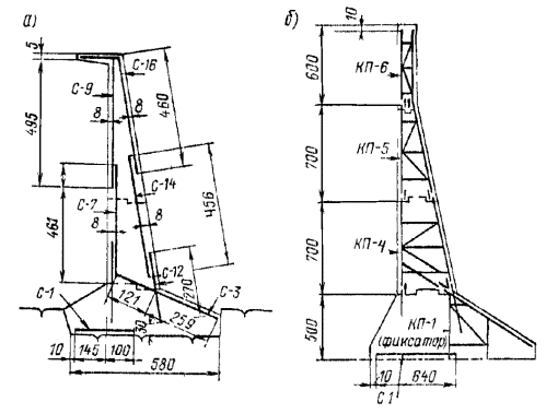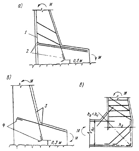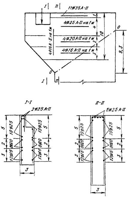 Примечания: 1. Коэффициент a2b допускается принимать в трещиностойких элементах равным единице, в нетрещиностойких элементах в растянутой зоне равным единице, в сжатой зоне равным нулю. 2. Высота сжатой зоны сечения в нетрещиностойких элементах определяется от действия всех нагрузок без учета силы противодавления и работы растянутого бетона при треугольной эпюре сжимающих напряжений в бетоне (см. п. 6.8 и прил. 6). Для элементов высотой h = 2 м и менее допускается определять высоту сжатой зоны в предположении прямоугольной эпюры сжимающих напряжений, т.е. из расчета прочности сечения без учета противодавления. Противодавление воды учитывается при расчете монолитных сечений и сечений, совпадающих со швами бетонирования. Усилие противодавления принимается равным площади эпюры напряжений, обусловленных воздействием противодавления. Напряжения в точках сечения принимаются равными a2bp, где р - интенсивность гидростатического давления, a2b - коэффициент эффективной площади противодавления в бетоне. Для трещиностойких элементов принимается линейный закон изменения интенсивности гидростатического давления воды р от давления на напорной (верховой) грани до давления на низовой грани. Для нетрещиностойких элементов в пределах трещин принимается равномерное давление, определяемое заглублением трещин под уровень воды, в пределах сжатой зоны сечения - линейный закон изменения интенсивности гидростатического давления. Высота сжатой зоны бетона определяется исходя из гипотезы плоских сечений при действии всех нагрузок без учета силы противодавления, при этом в нетрещиностойких элементах работа растянутого бетона не учитывается и форма эпюры напряжений бетона в сжатой зоне сечения принимается треугольной (см. п. 6.8 и прил. 6). Коэффициенты эффективной площади противодавления a2b для сооружений I и II классов рекомендуется определять на основании экспериментальных исследований. При отсутствии данных экспериментальных исследований в сечениях изгибаемых, внецентренно сжатых и внецентренно растянутых элементов допускается принимать a2b равным единице в растянутой зоне и равным нулю в сжатой зоне сечения. 1.9 (4.5). При расчете сборных конструкций на усилия, возникающие при их подъеме, транспортировании и монтаже, нагрузку от веса элемента рекомендуется вводить с коэффициентом динамичности, равным при транспортировании 1,6, при подъеме и монтаже 1,4. Допускается принимать обоснованные более низкие значения коэффициентов динамичности, но не ниже 1,25. 1.10. Сборно-монолитные конструкции рекомендуется рассчитывать в соответствии с пп. 3.72-3.75 настоящего Пособия. 1.11. Расчет элементов конструкций на выносливость рекомендуется производить согласно пп. 3.63-3.71 настоящего Пособия. 1.12 (4.13). Расчет сечений на косое внецентренное сжатие, косой изгиб, кручение, отрыв, расчет закладных деталей рекомендуется выполнять в соответствии с указаниями СНиП 2.03.01-84 [2] с учетом коэффициентов, принятых в СНиП 2.06.08-87 [1]. Пример расчета к п. 1.8Пример 1. Дано. Консольная железобетонная стена переменного сечения высотой l = 15 м, воспринимающая давление воды (рис. 1); gс = 1,0; высота сечения I-I на расстоянии l1 = 5 м от верха стены и уровня воды h1 = 1 м; высота корневого сечения II-II h2 = 3 м; а = а¢ = 0,15 м; класс сооружения III (gп = 1,15); основное сочетание нагрузок (glс = 1,0); бетон класса В15 (Rbt,ser = 1,15 М