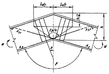 3. РАСЧЕТ ЭЛЕМЕНТОВ БЕТОННЫХ И ЖЕЛЕЗОБЕТОННЫХ КОНСТРУКЦИЙ НА ПРОЧНОСТЬ И ВЫНОСЛИВОСТЬРасчет бетонных элементов на прочность3.1 (5.1). Расчет на прочность бетонных элементов следует производить для сечений, нормальных к их продольной оси. Расчет на прочность элементов, в которых условия наступления предельного состояния не могут быть выражены через усилия в сечениях, следует выполнять для площадок действия главных напряжений. В зависимости от условий работы элементы рассчитываются без учета или с учетом сопротивления растянутой зоны сечения. Без учета сопротивления бетона растянутой зоны сечения рассчитываются внецентренно сжатые элементы, в которых по условиям эксплуатации допускается образование трещин. С учетом сопротивления бетона растянутой зоны сечения рассчитываются все изгибаемые элементы, а также внецентренно сжатые элементы, в которых по условиям эксплуатации образование трещин не допускается. При расчетах прочности следует учитывать пониженную на растяжение прочность строительных швов, вводя в расчеты вместо Rbt величину yRbt. Для сооружений I и II классов коэффициент y следует определять на основании экспериментов. Для сооружений I и II классов на предварительных стадиях проектирования, а для сооружений III и IV классов во всех случаях допускается принимать y = 0,5. Примечание. В общем случае продольной осью элемента следует считать линию, равноудаленную от его граней. Разрешается принимать ось элементов вертикальной или горизонтальной. Например, на рис. 2 показана локальная (относящаяся только к сечению i-i) вертикальная ось «консоли» арочной плотины. Рис. 2. Схема консоли арочной плотины i-i - расчетное сечение; q1, q2 - углы между осью консоли в сечении i-i и гранями соответственно верховой и низовой 3.2 (5.2). Бетонные конструкции, прочность которых определяется прочностью бетона растянутой зоны сечения, допускаются к применению в том случае, если образование трещин в них не приводит к разрушению, к недопустимым деформациям или к нарушению водонепроницаемости конструкции. При этом является обязательной проверка трещиностойкости элементов таких конструкций с учетом температурно-влажностных воздействий в соответствии с разд. 7 настоящего Пособия. Применение изгибаемых бетонных конструкций простейшего вида (балки на двух опорах, консоли и др.) допускается в том случае, если они лежат на упругом основании, рассчитываются только на нагрузку от собственного веса и под ними не могут находиться люди и оборудование, а также когда при расчете с учетом температурно-влажностных воздействий в соответствии с разд. 7 настоящего Пособия доказана трещиностойкость таких конструкций. Для внецентренно сжатых элементов необходимо проверять прочность бетона сжатой зоны в предположении образования трещин и устойчивость свободно стоящих элементов на опрокидывание. Изгибаемые элементы3.3 (5.3). Расчет бетонных изгибаемых элементов производится по формуле glcgnM £ gcghgshgbRbtWt, (4) где glc, gn - соответственно коэффициенты сочетания нагрузок и надежности по назначению сооружения, принимаемые по п. 1.3 настоящего Пособия; gc - коэффициент условий работы сооружения, принимаемый по строительным нормам и правилам на проектирование отдельных видов гидротехнических сооружений и по п. 1.3; gh, gsh - соответственно коэффициенты, учитывающие влияние на прочност