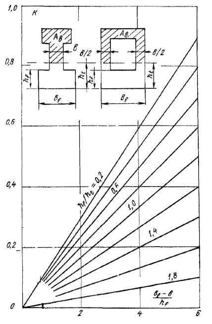 Коэффициент gsh для прямоугольного, кругового, крестового сечений, а также для таврового с полкой в сжатой зоне принимается равным 1,0. Для таврового сечения с полкой в растянутой зоне, для коробчатых двутавровых сечений, а также для кольцевого сечения коэффициент gsh вычисляется по формуле где К - коэффициент, зависящий от соотношения размеров сечения; gh - коэффициент, определяемый по формуле (5). Для кольцевого сечения коэффициент К равен отношению внутреннего и наружного диаметров. Для таврового сечения с полкой в растянутой зоне, для коробчатого и двутаврового сечений коэффициент К рассчитывается: при