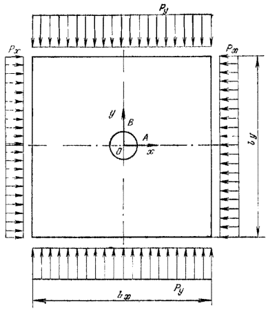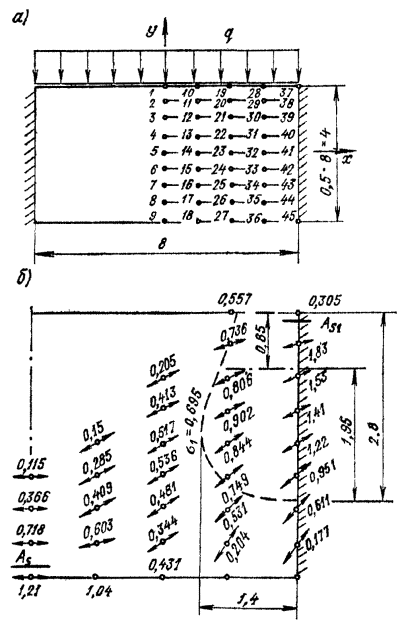 (сечение прямоугольное). Для растянутого волокна условие прочности проверяем по формуле (18) настоящего Пособия: 1,0×1,15× Условие прочности растянутой зоны выполняется. Для сжатого волокна условие прочности проверяем по формуле (17): 1,0×1,15× Условие прочности сжатой зоны выполняется с большим запасом. Пример 8. Дано. Бетонная конструкция энергетического сооружения (gс = 1,0) I класса (gп = 1,25) - прямоугольная плита 5´5 м толщиной 1 м, ослабленная круглым отверстием диаметром 1,6 м (рис. 7), изготовлена из бетона класса В20 (Rb = 11,5 МПа, Rbt = 0,9 МПа). При основном сочетании нагрузок (glc = 1,0) рх = 0,76 МПа, ру = 2,90 МПа. Конструкция не воспринимает напор воды и не подвержена действию агрессивной среды. Возникновение трещин не допускается (gb = 0,9). Требуется проверить прочность конструкции. Рис. 7. К примеру расчета 8 Рис. 8. К примеру расчета 9 Расчет. Конструкция представляет собой балку-стенку, предельное состояние которой не может быть выражено через усилия в каких-либо сечениях. В этом случае проверку прочности выполняем по максимальным главным сжимающим и растягивающим напряжениям. При lх : 2r = lу : 2r = 5:1,6 = 3,1 > 3,0 размеры плиты можно принимать бесконечно большими. В этом случае напряженное состояние может быть определено по классическому решению теории упругости (задача Кирша). Наибольшие значения главных сжимающих напряжений (в точке А)