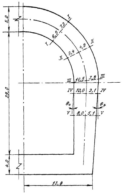 где r - радиус дуги, проведенный через центры тяжести замкового и пятового сечений арки. Таблица 15