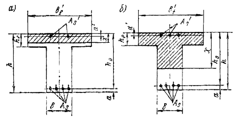 следующим образом: 1) при x £ xRho - из условия (26); 2) при x > xRho - из условия glcgnM £ gc[gbRbxR(1 - 0,5xR)bho2 + gsRscA¢s(ho - a¢)] (41) или из условия (27) с подстановкой х = xRho; 3) при х £ 0 - из условия (32) glcgnM £ gcgsRsAs(ho - a¢). При невыполнении условий прочности (26), (32), (41) рекомендуется увеличить высоту сечения или повысить класс бетона. Расчет тавровых (двутавровых) сечений3.17. Расчет изгибаемых элементов таврового (двутавровогo) сечения производится в зависимости от положения границы сжатой зоны: а) если граница сжатой зоны проходит в полке (рис. 11, а), т.е. при соблюдении условия glcgnM £ gcgbRbbf¢hf¢(ho - 0,5hf¢), (42) расчет выполняется как для прямоугольного сечения шириной в соответствии с пп. 3.12-3.16; Рис. 11. Форма сжатой зоны в поперечном сечении таврового железобетонного элемента со сжатой полкой а - при расположении границы сжатой зоны в полке; б - то же в ребре б) если граница сжатой зоны проходит в ребре (рис. 11, б), т.е. условие (42) не выполняется, расчет производится из условия glcgnM £ gc[gbRbbx(ho - 0,5x) + gbRb(bf¢ - b)hf¢(ho - 0,5hf¢) + gsRscA¢s(ho - a¢)] (43) 3.18. Подбор площади сечения продольной арматуры производится следующим образом. Вычисляется высота сжатой зоны бетона при одиночной арматуре по формуле При x £ xRh необходимая площадь сечения растянутой арматуры определяется по формуле Если высота сжатой зоны, вычисленная по формуле (44), находится в пределах 2а¢ £ x £ xRho, то при неизвестной площади сечения сжатой арматуры допускается площадь сечения растянутой арматуры As рассчитывать по формуле